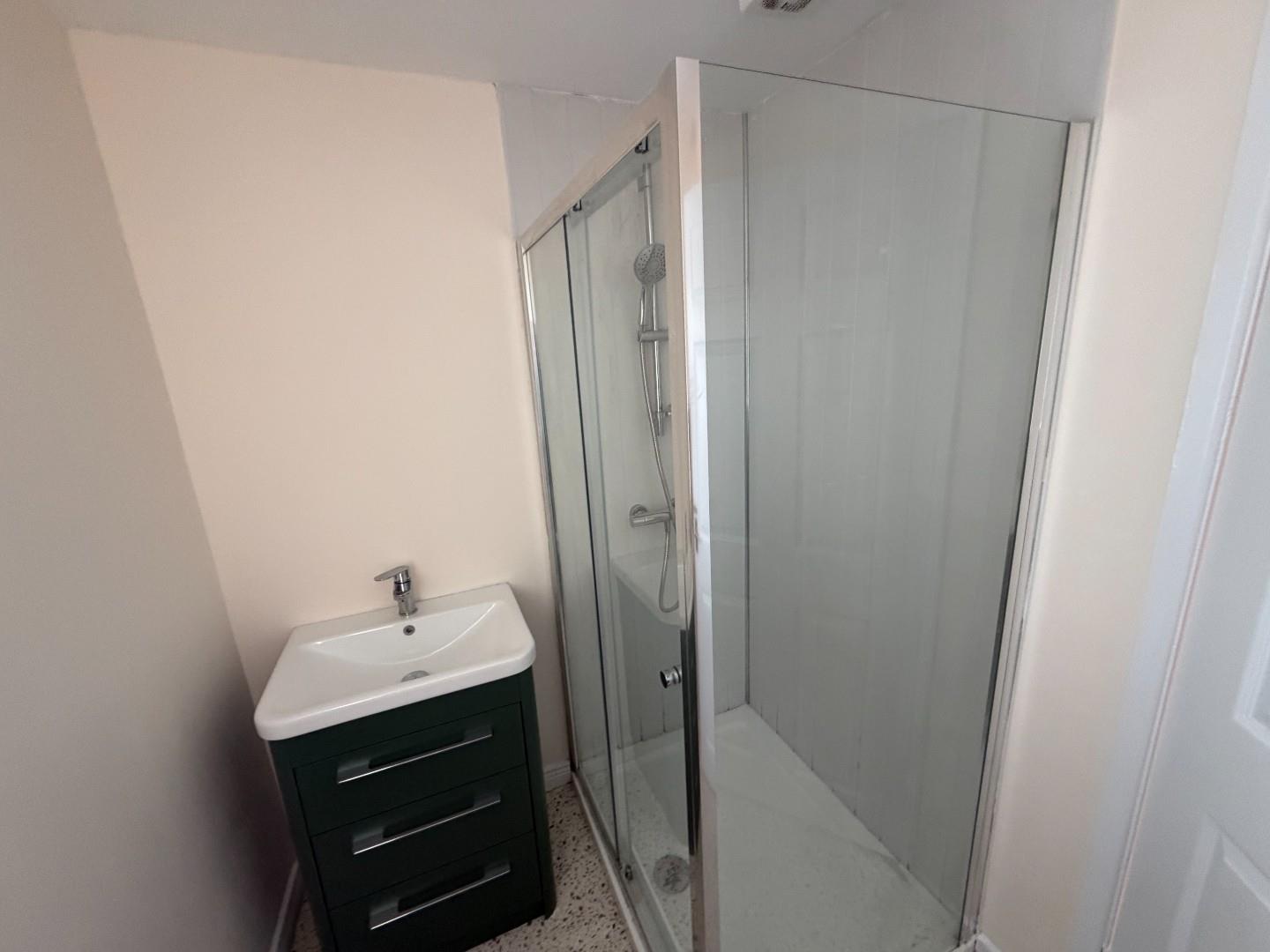 New bathroom with LFWC, wash hand basin and storage shelves, large shower cubicle with glass sides and PVC walls , extractor, chrome towel rad.