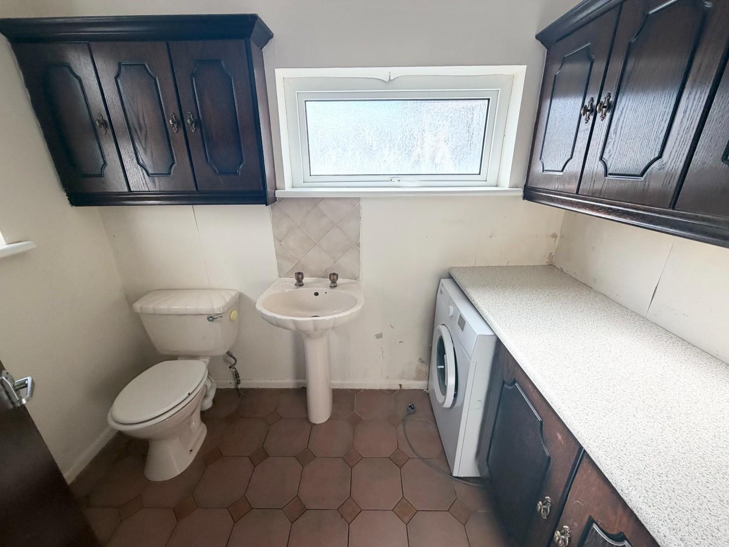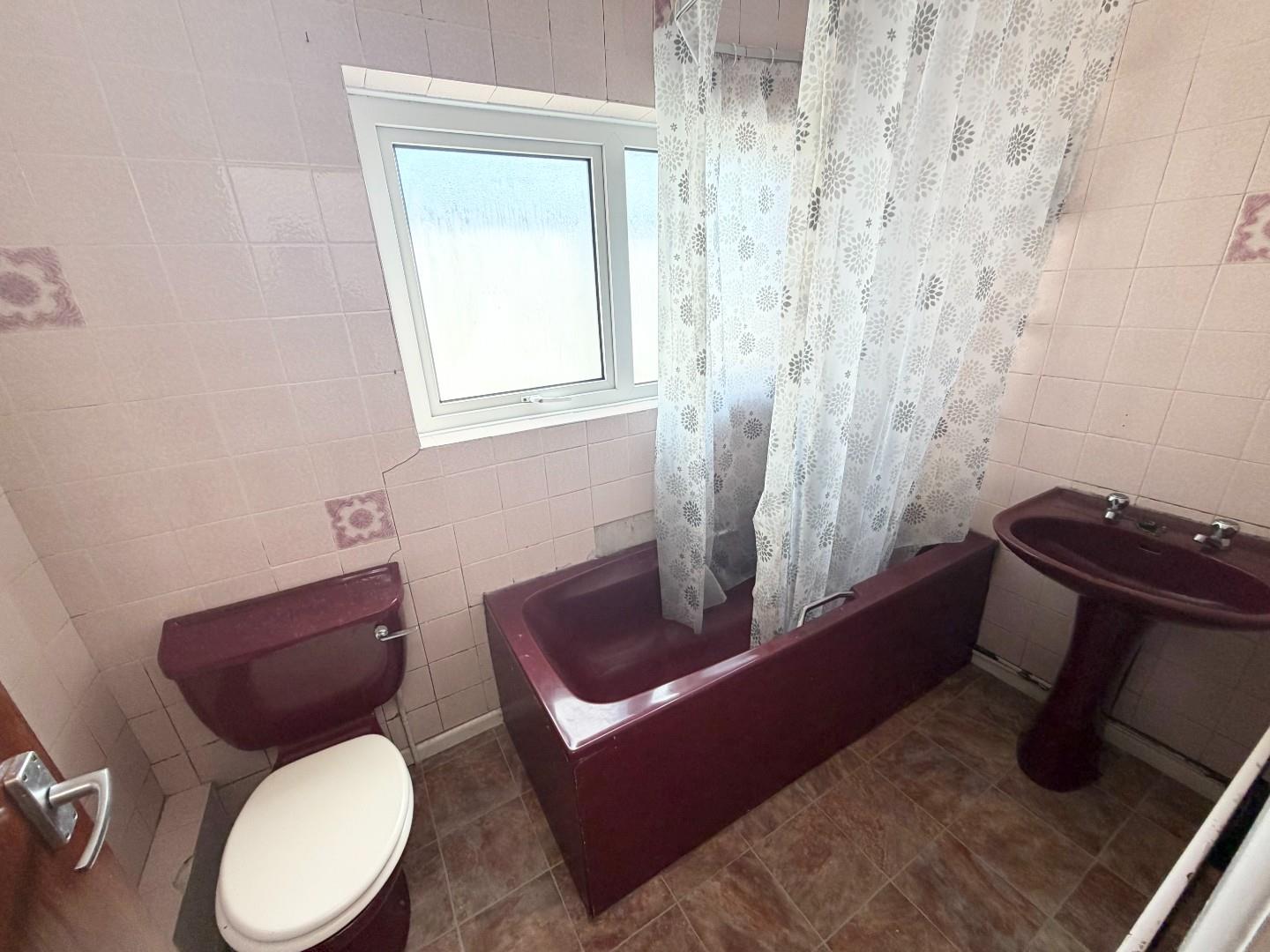 Original burgundy suite with panel bath, pedestal wash hand basin, LFWC, tiled wall, extractor.