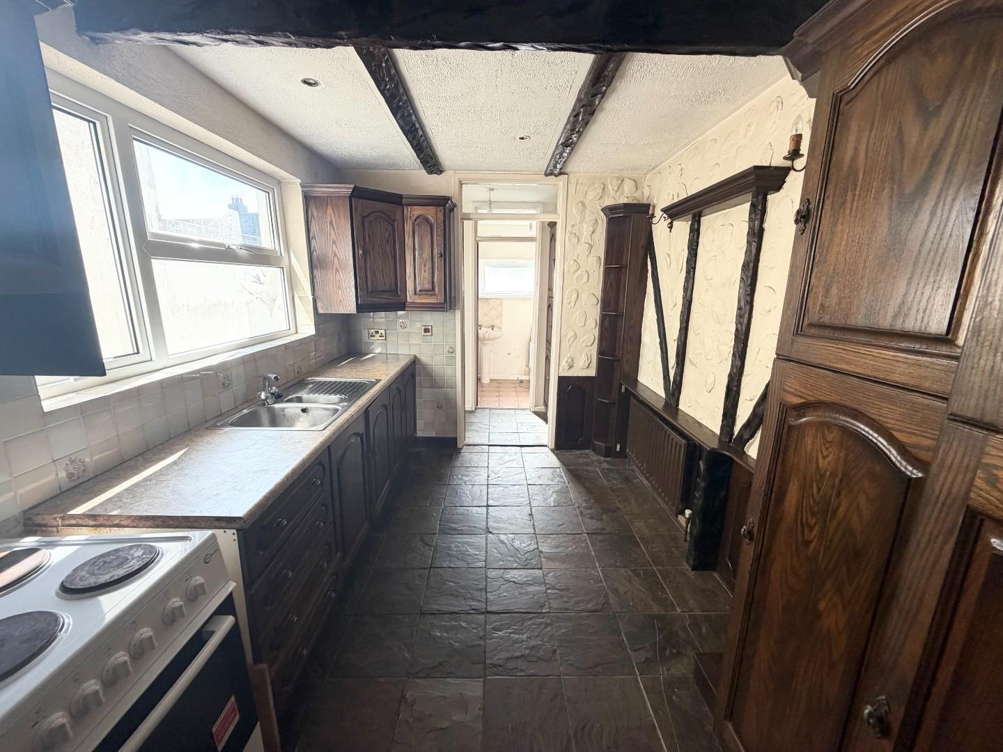 High and low level units, 11/2 stainless steel sink and drainer, fridge freezer, wired for electric cooker, part tiled wall, tiled floor. Roof beams.