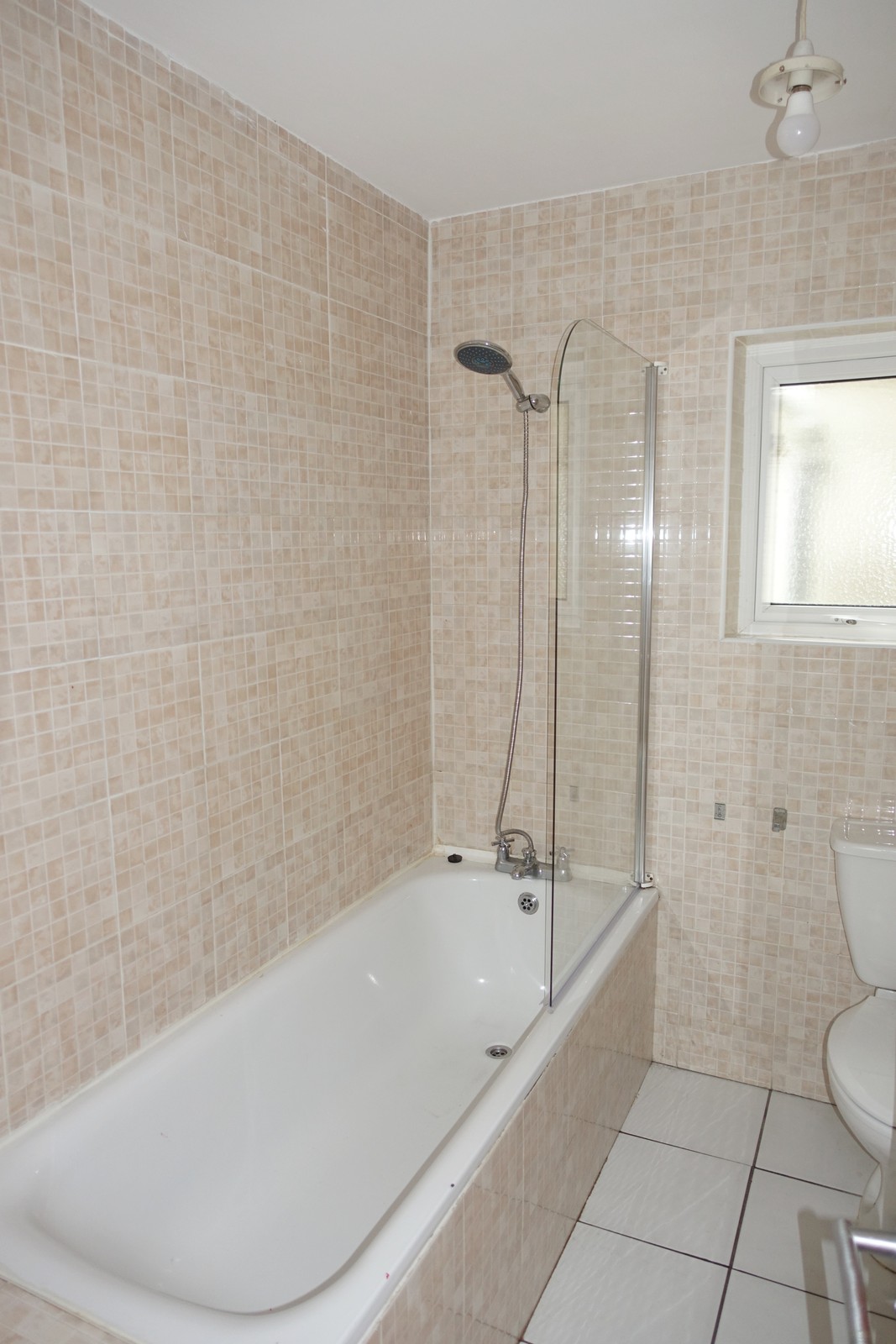 3-piece white suite, shower screen to bath with shower tap off bath, tiled floor, fully tiled walls.
