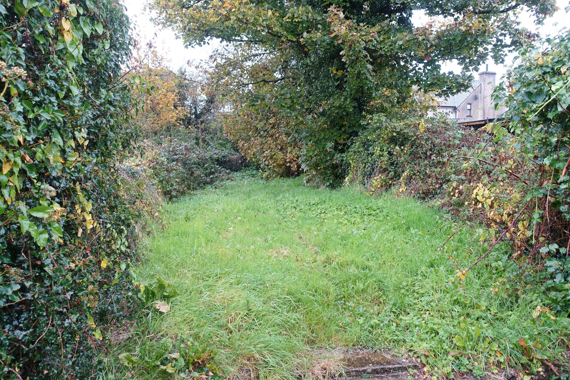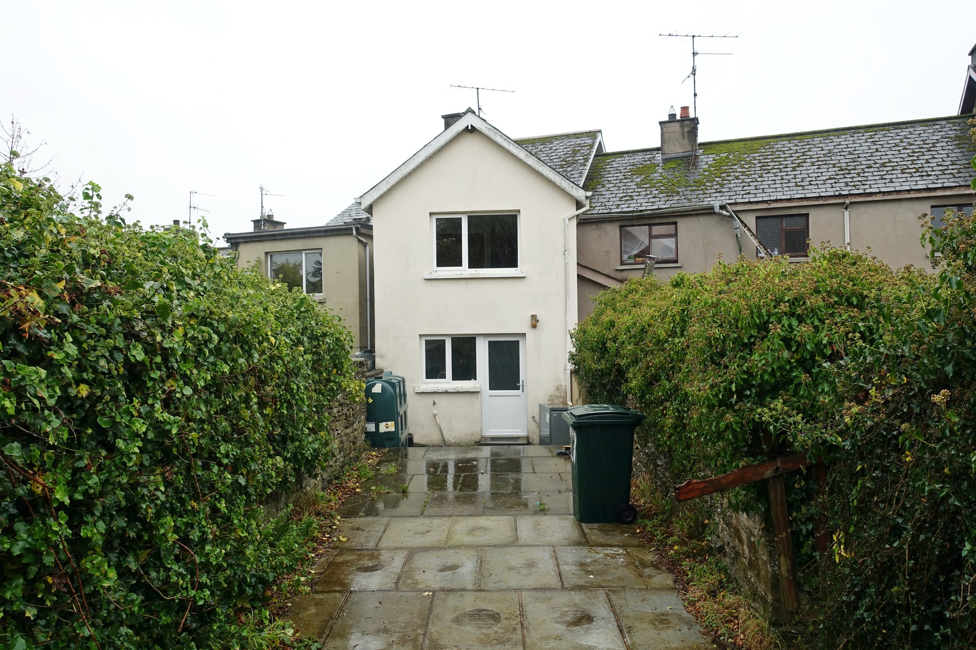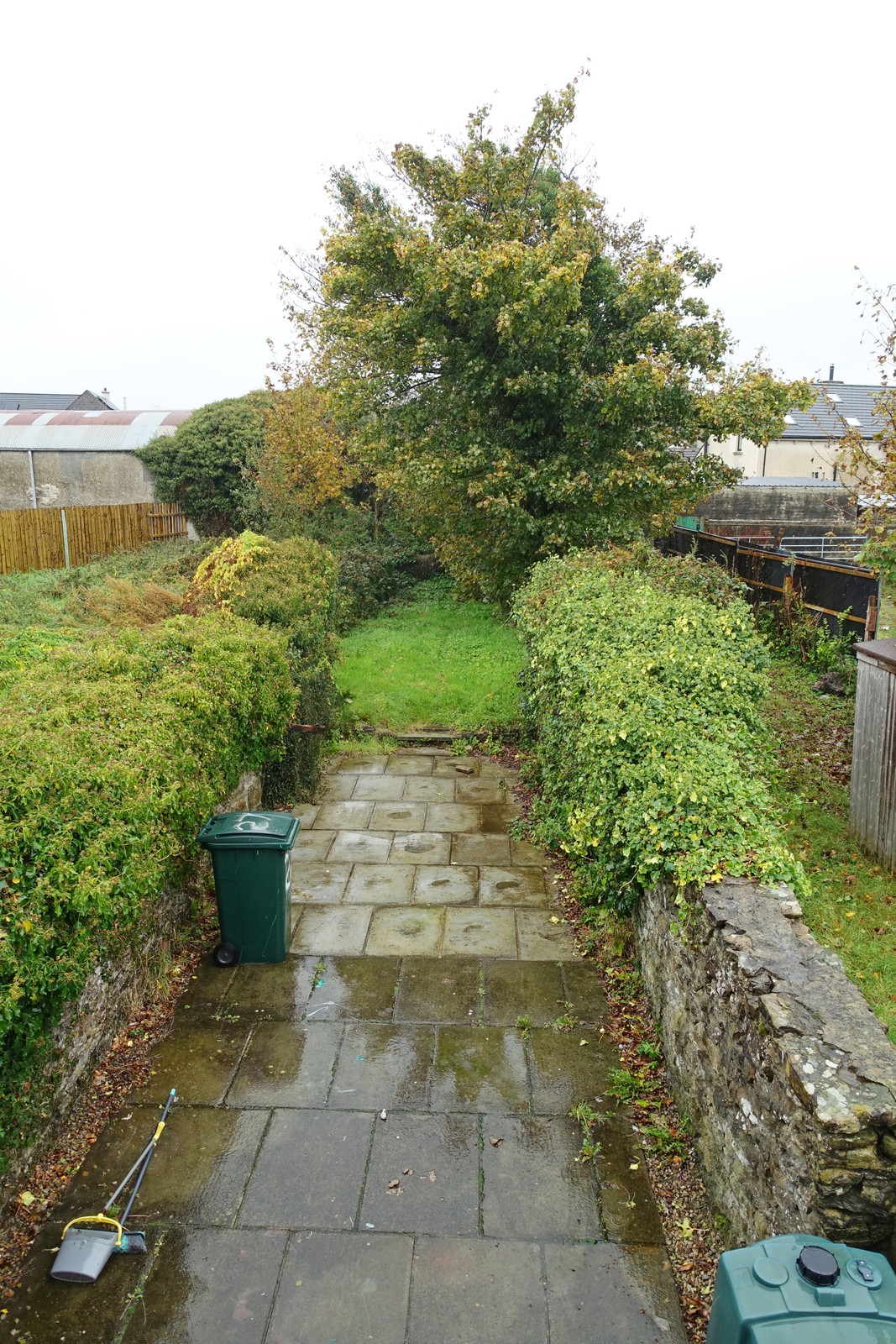 Enclosed rear garden with access from a shared entry off main street, paved patio area, lawn surrounded by original stone walls.