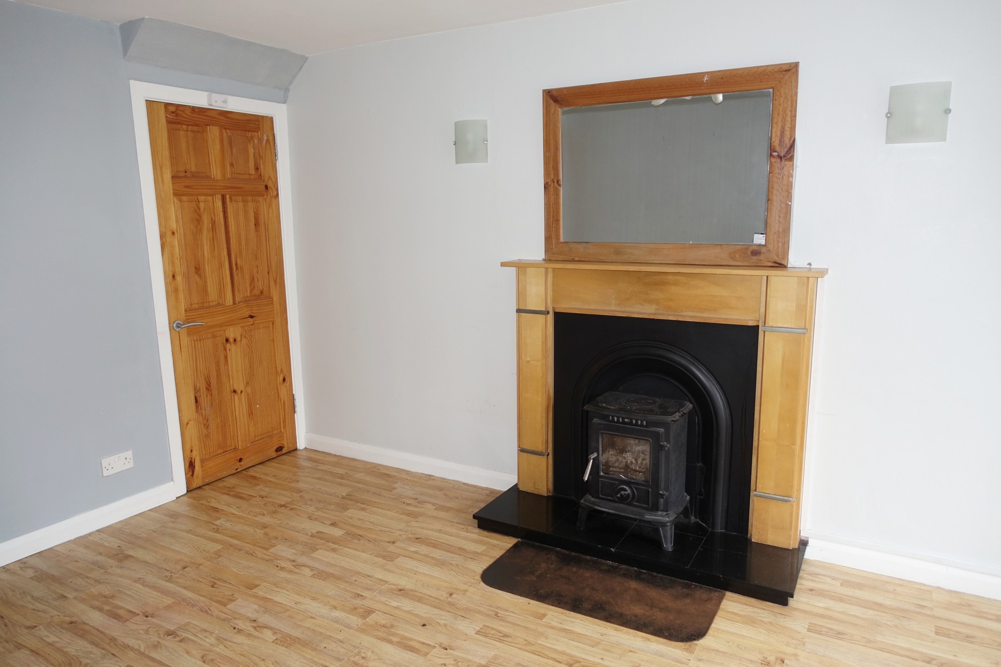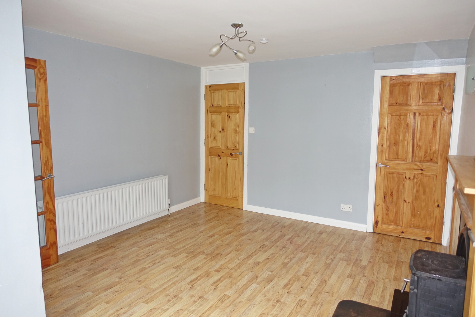 Multi fuel stove, surround with cast iron inset and tiled hearth, under stairs storage, laminate floor.