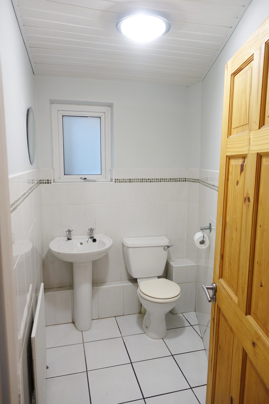 Wc & whb, tiled floor & half tiled walls, PVC cladding on ceiling.