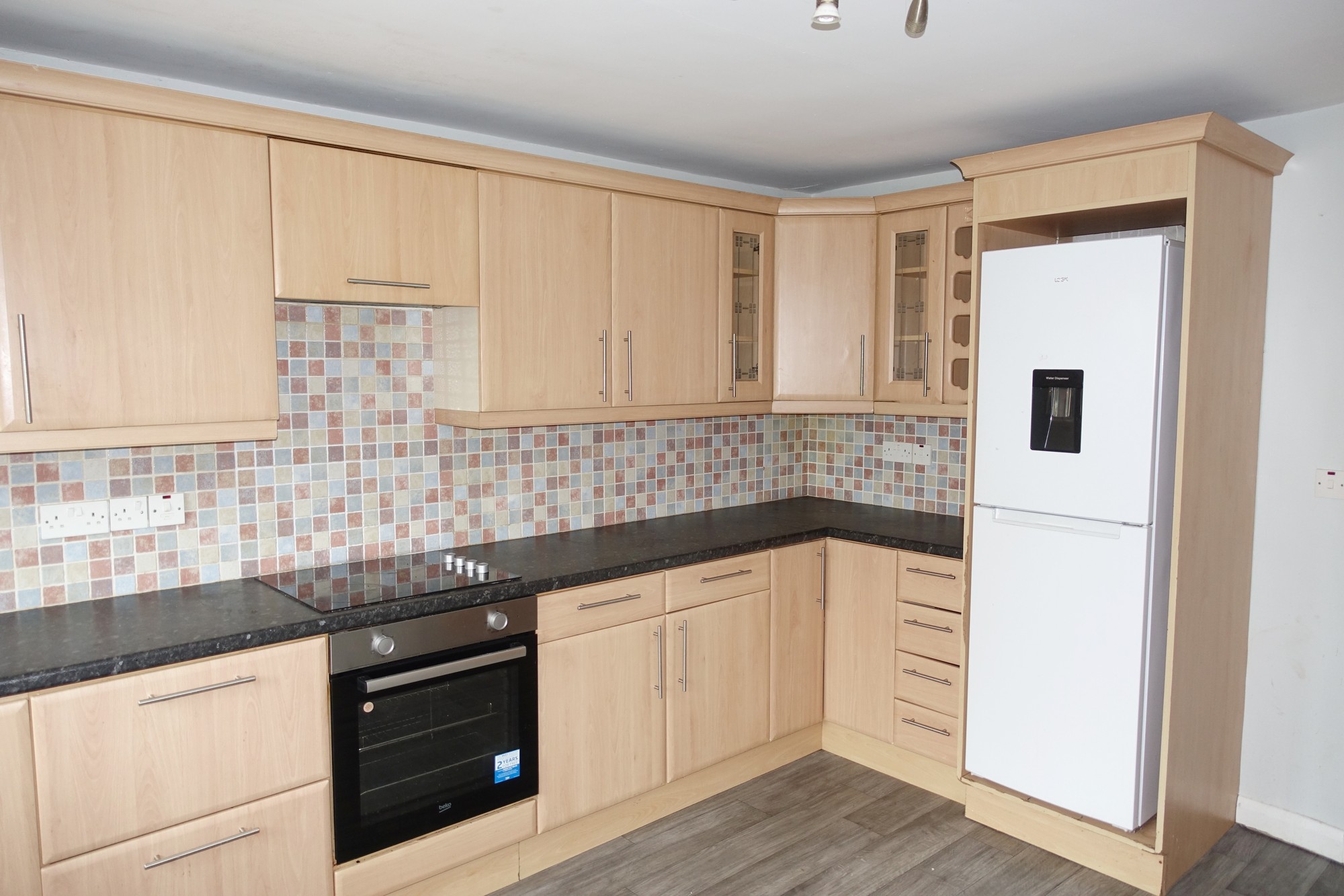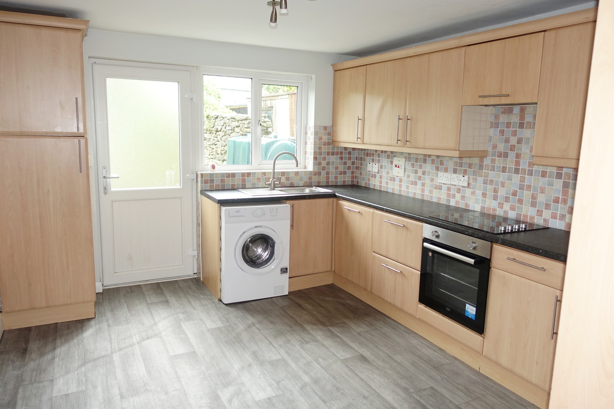 Fitted kitchen with a range of high & low level units, wine rack & glazed units, s.s sink, integrated hob, oven & grill, extractor fan, plumber for dishwasher & washing machine, tiled floor.