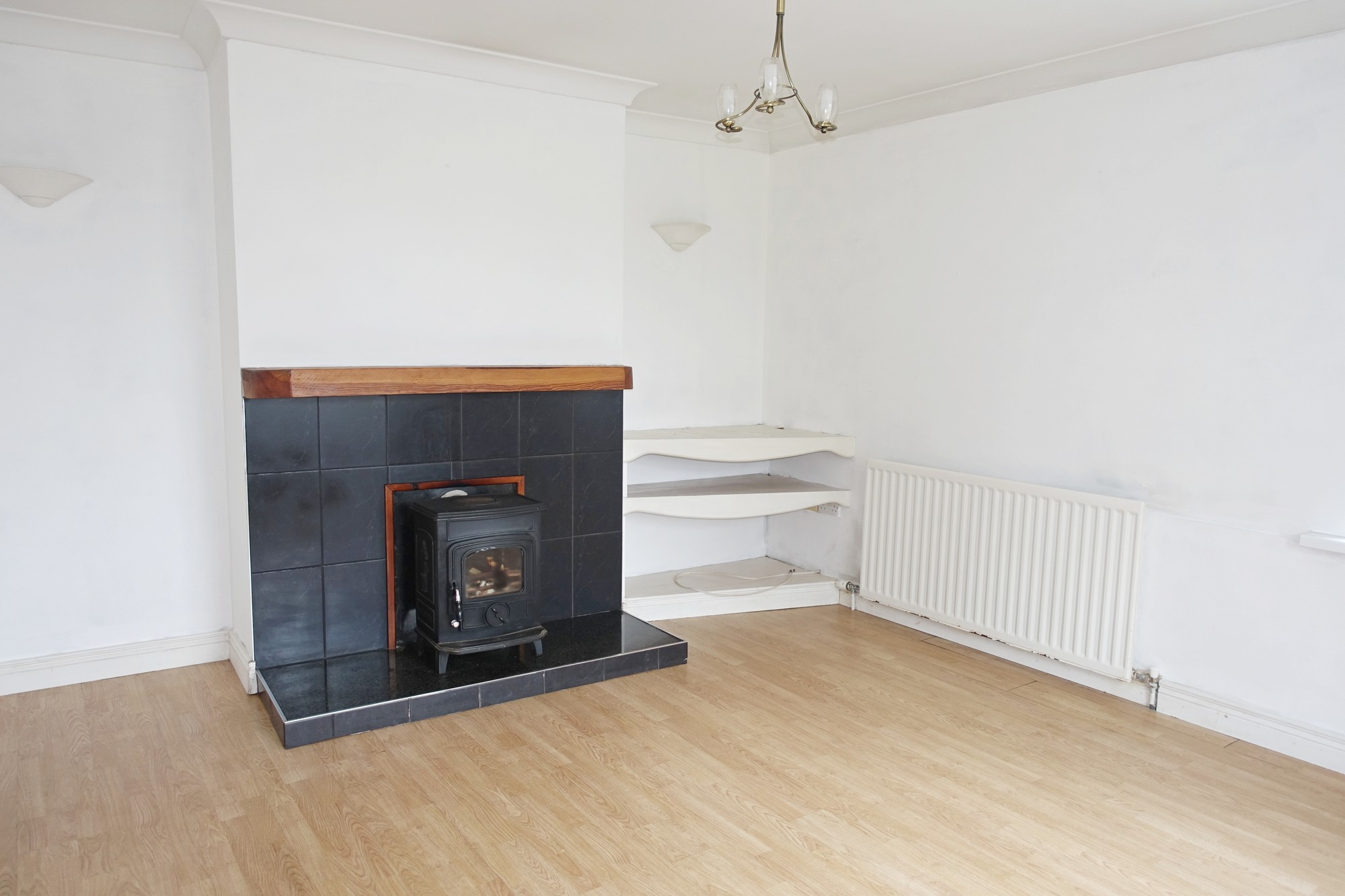 Tiled fireplace, multi fuel stove linked to heating system, set on granite hearth, sleeper mantel, ceiling cornice, moulded centre piece, fitted shelving, laminate flooring.
