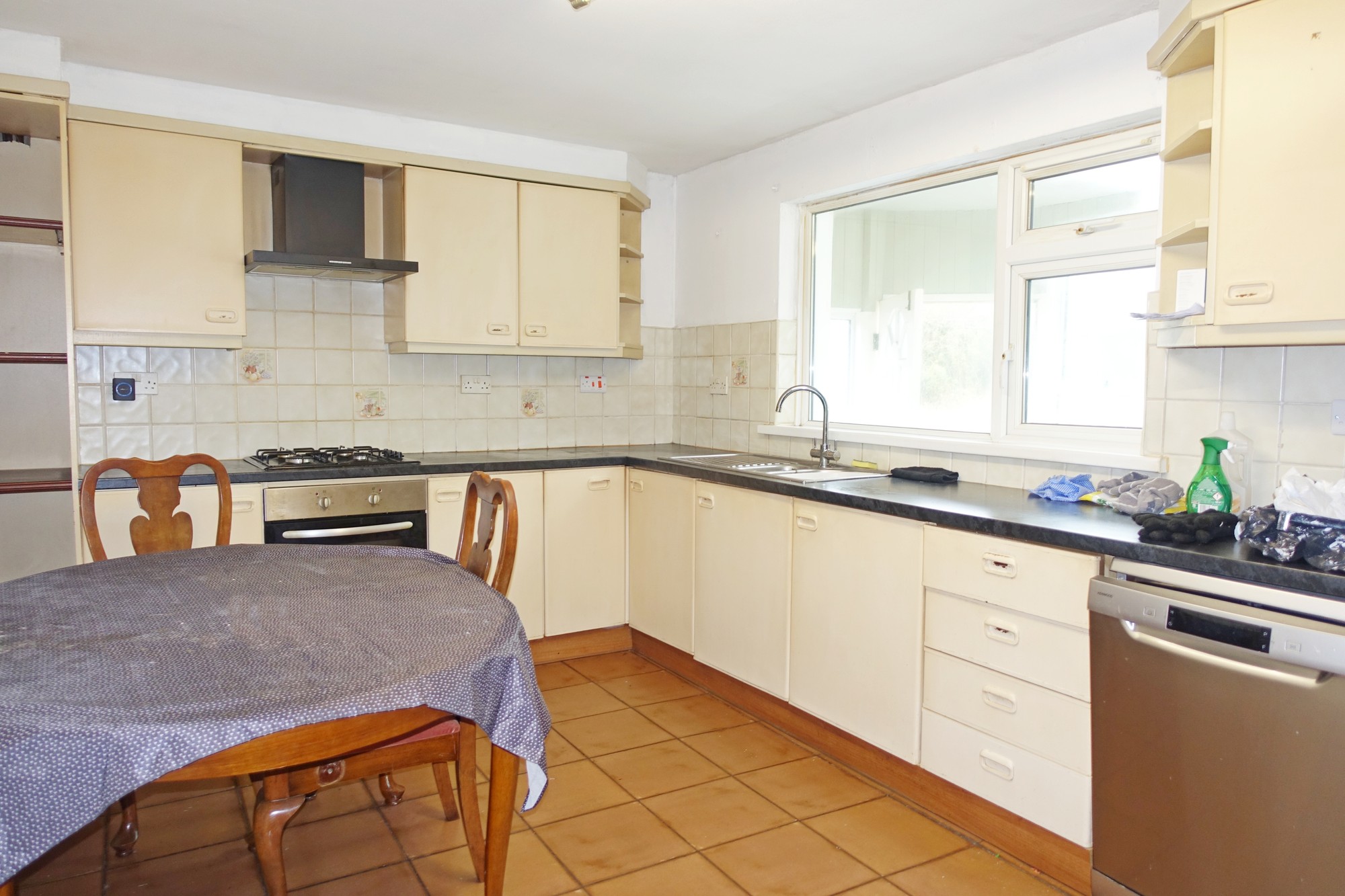 Fitted kitchen with a range of high and low level units, gas hob & electric oven, extractor fan hood, plumbed for dishwasher, tiled splashback, tiled floor, archway to Dining Room.