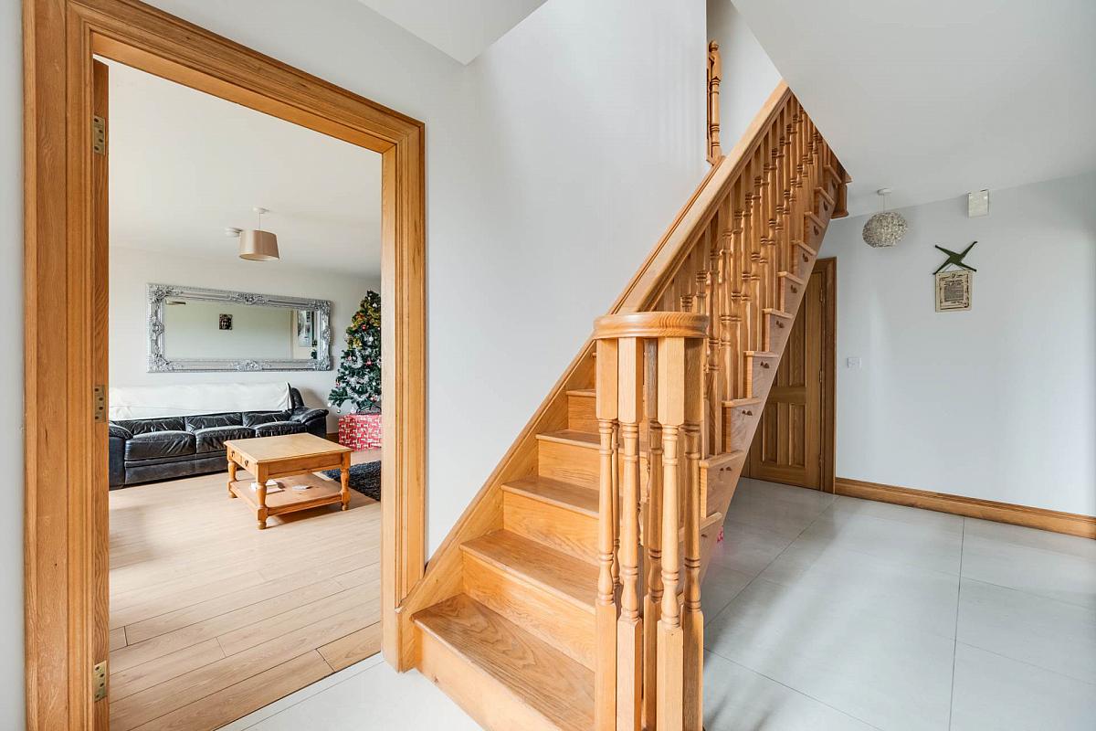 PVC exterior door with glazed inset & side screen, tiled floor, solid Oak staircase.