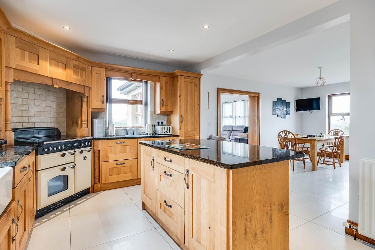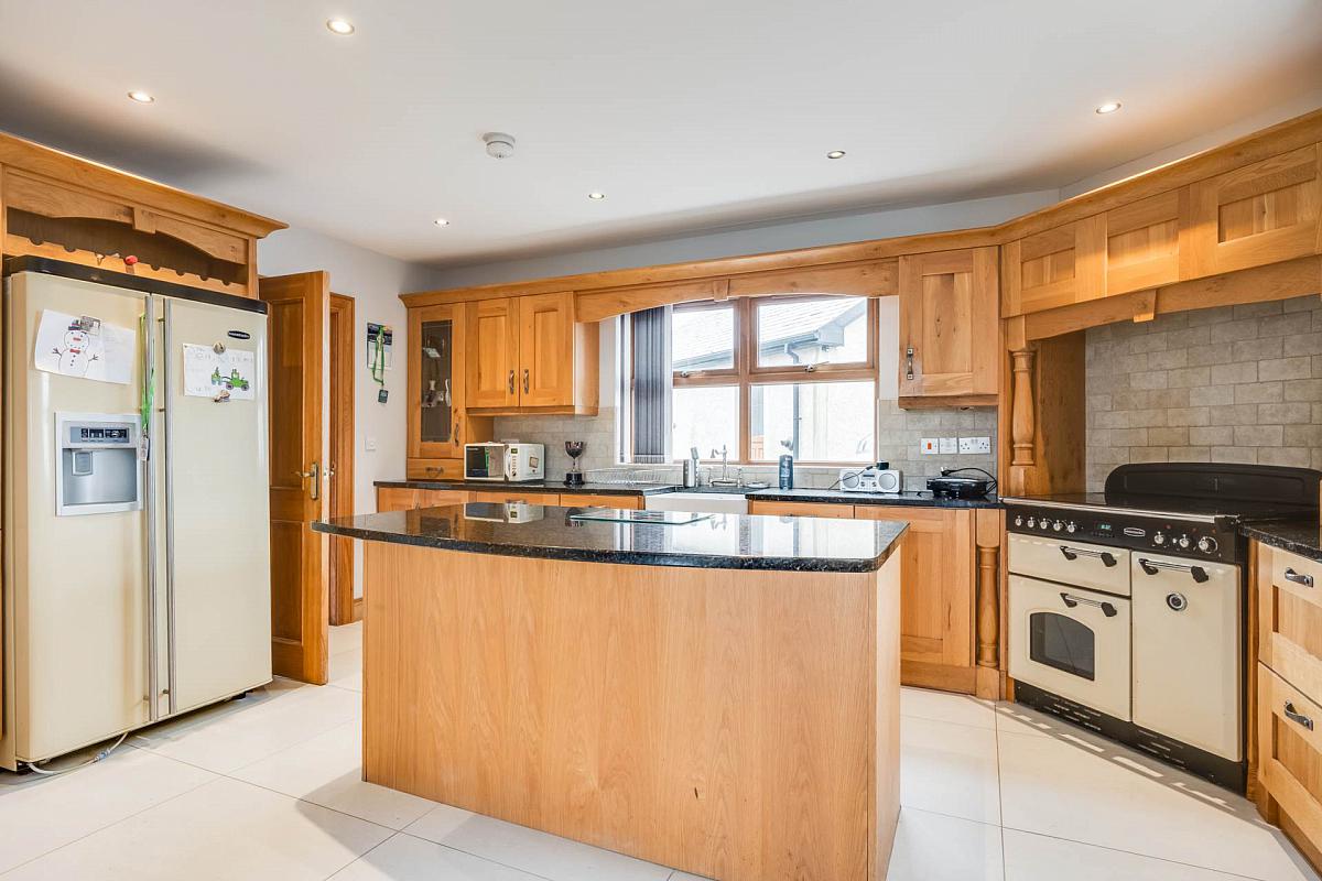 Fitted solid Oak kitchen, range of high & low level units, granite work top, jaw box ceramic sink, farm house style cooker surround, integrated dishwasher, plumbed for American fridge freezer, wine rack, island unit with breakfast bar lip, tiled floor & splash back