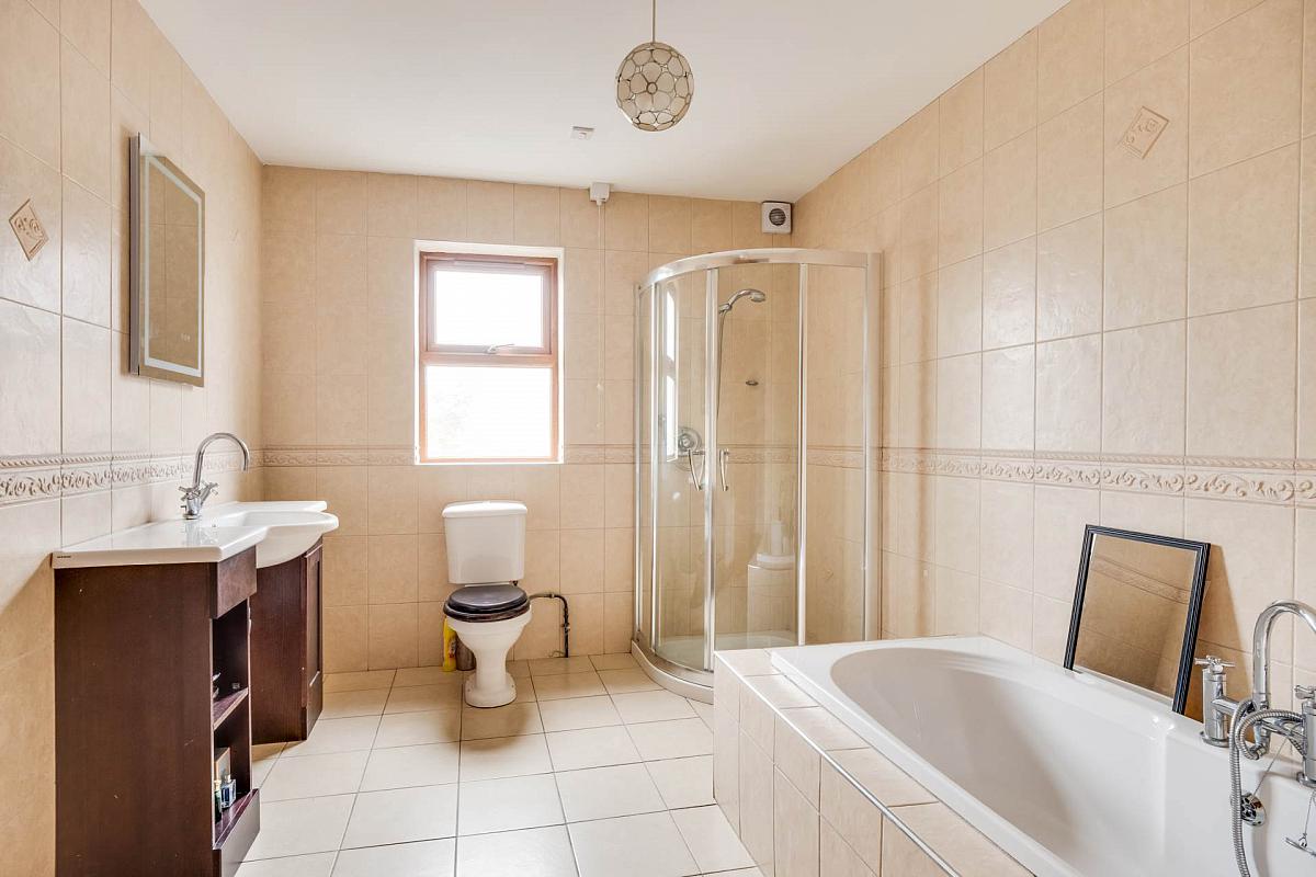 White suite, panelled bath with telephone shower taps, step in shower cubicle with thermostatically controlled shower, fully tiled.