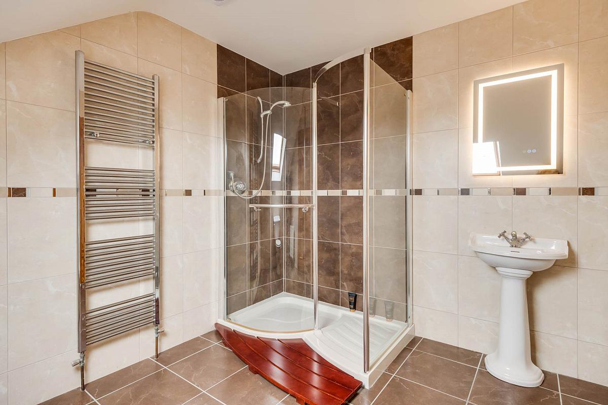 White suite, large step in shower cubicle, thermostatically controlled shower, fully tiled.