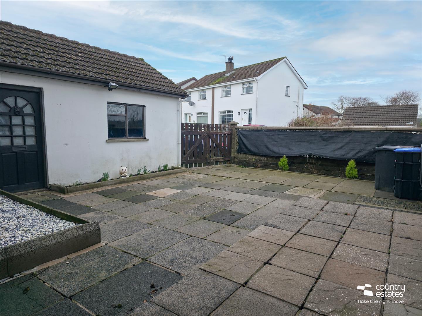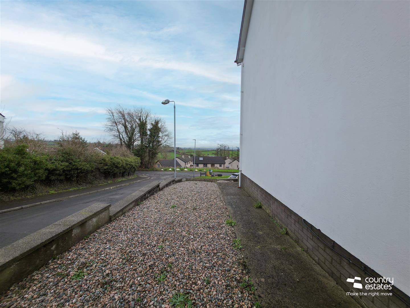 Paved walkway to side with pebbled garden for easy maintenance.