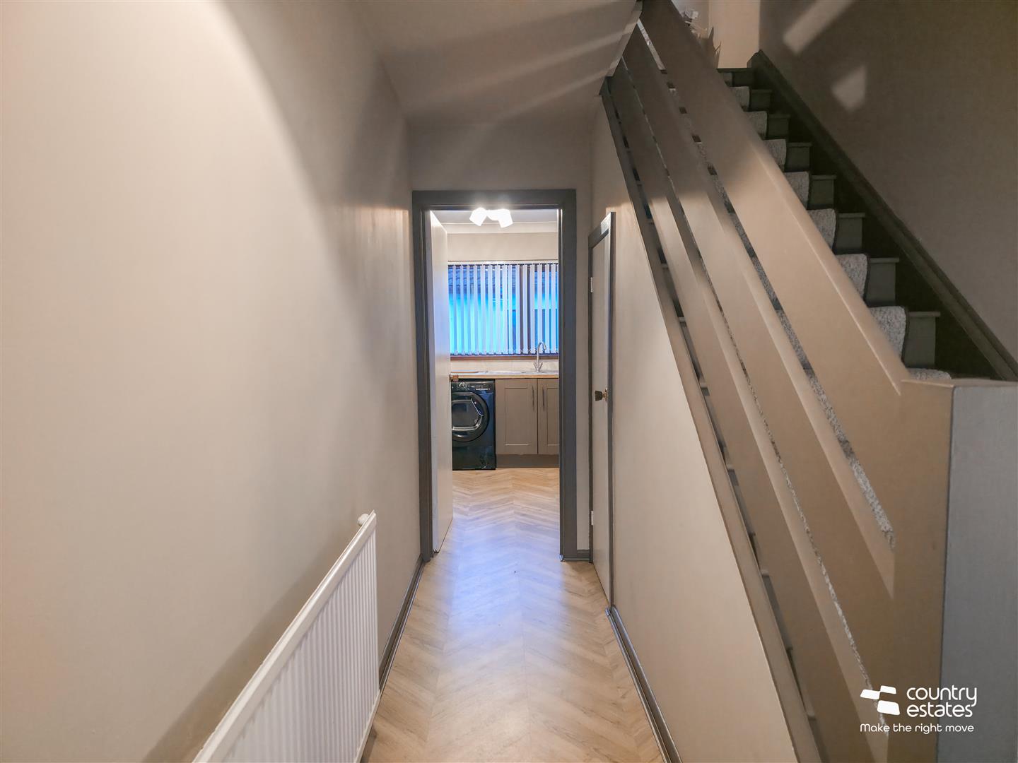 PVC double glazed front door with matching side screens into spacious well presented entrance hall. Quality Herringbone effect laminate flooring. Under stairs storage cupboard.