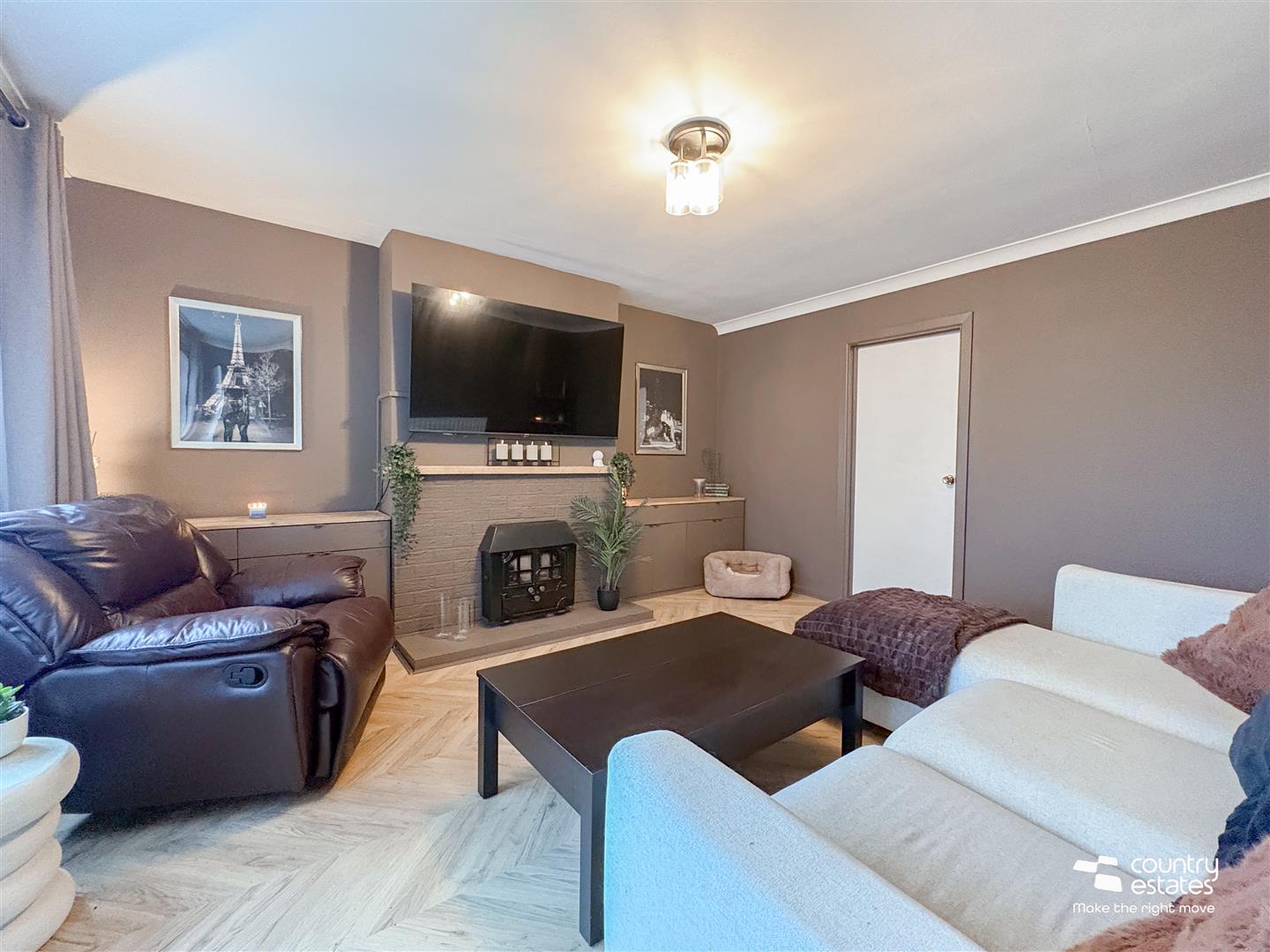 Attractive feature fireplace with inset wood burning stove. Picture style window to front aspect with far reaching views over surrounding country side. Quality Herringbone effect laminate flooring.