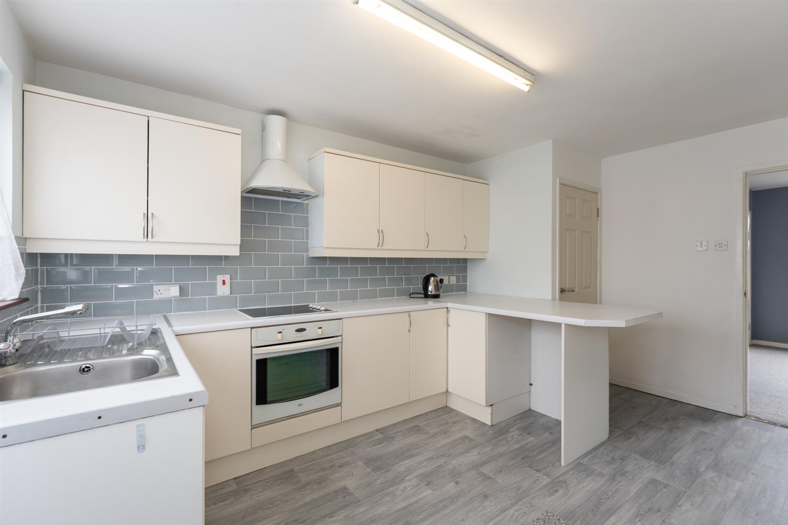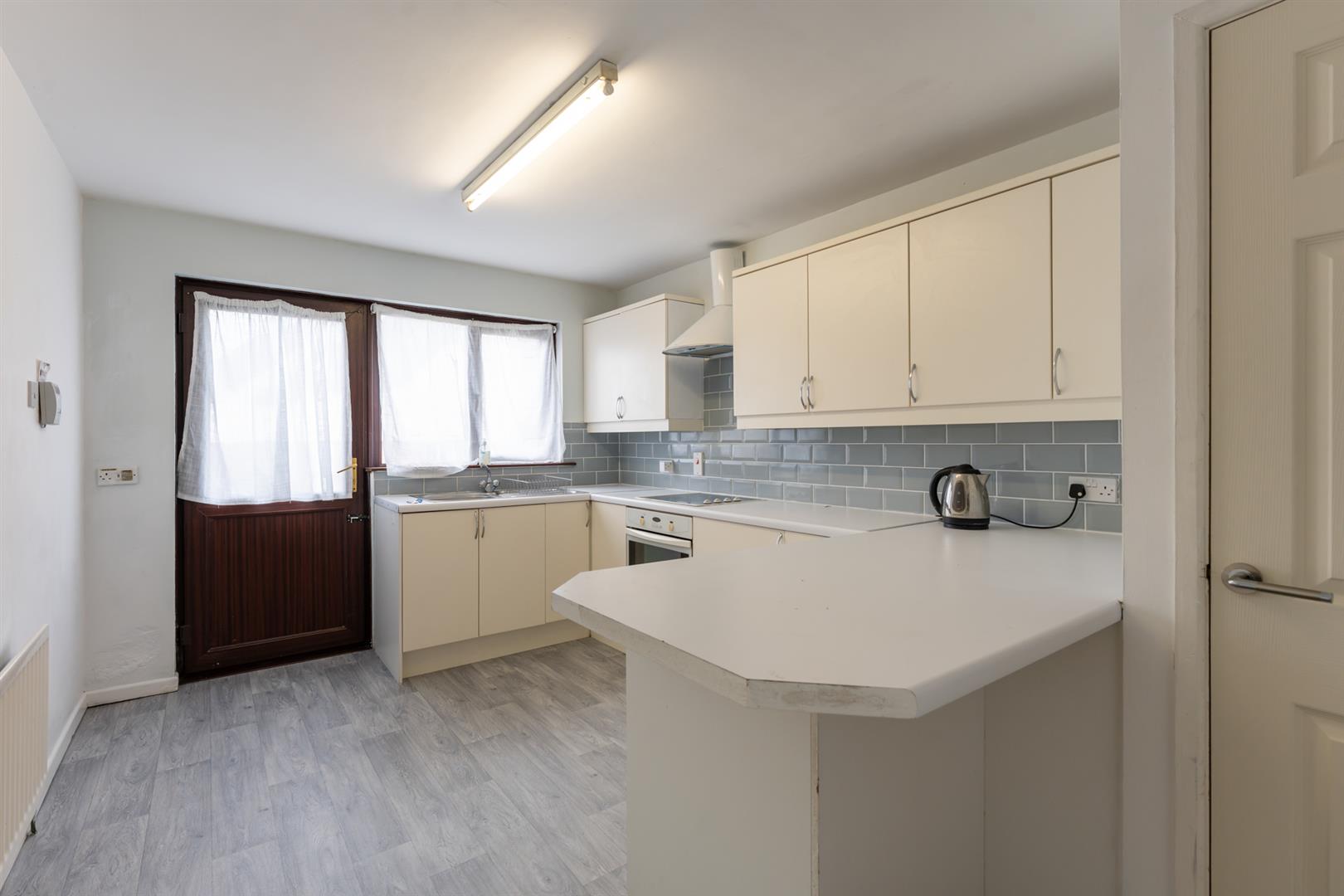 Modern fitted kitchen with range of high and low level storage units with contrasting, melamine work surface. Stainless steel sink unit with draining bay. Integrated, ceramic hob with extractor hood over. Integrated oven. Space for under counter fridge. Splashback tiling to walls. Access to utility store. Access to integral garage. PVC double glazed door to driveway.