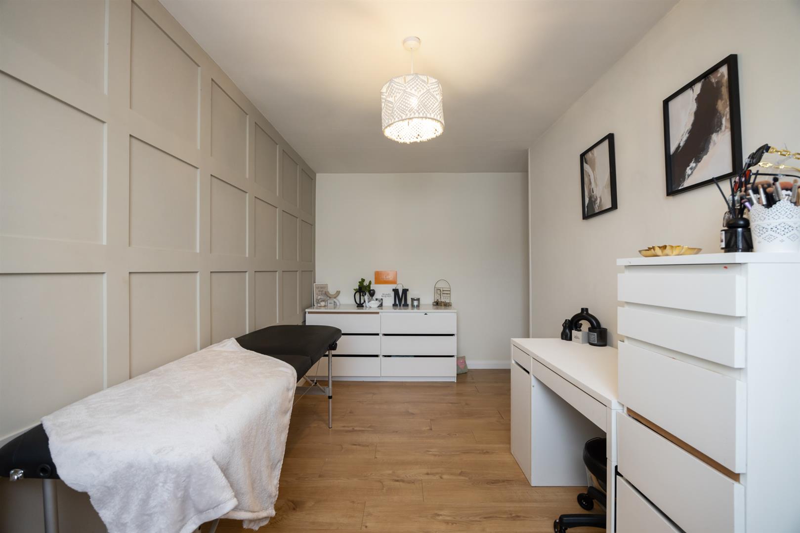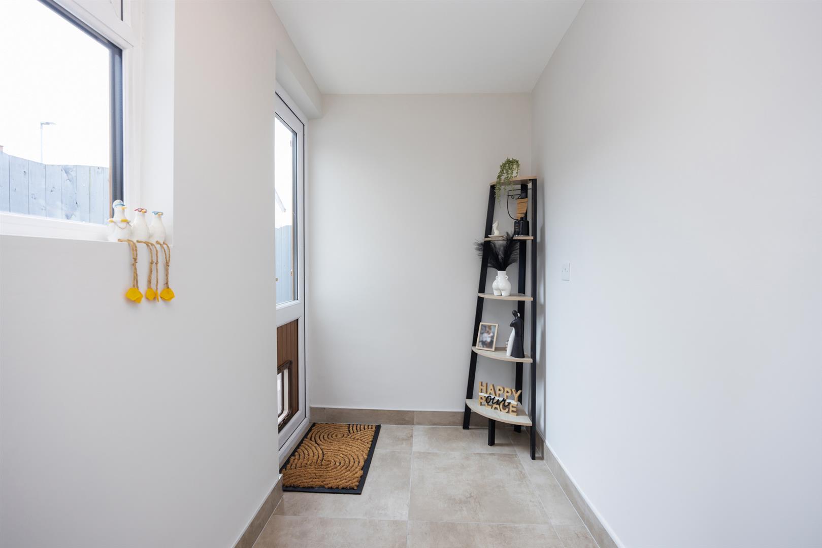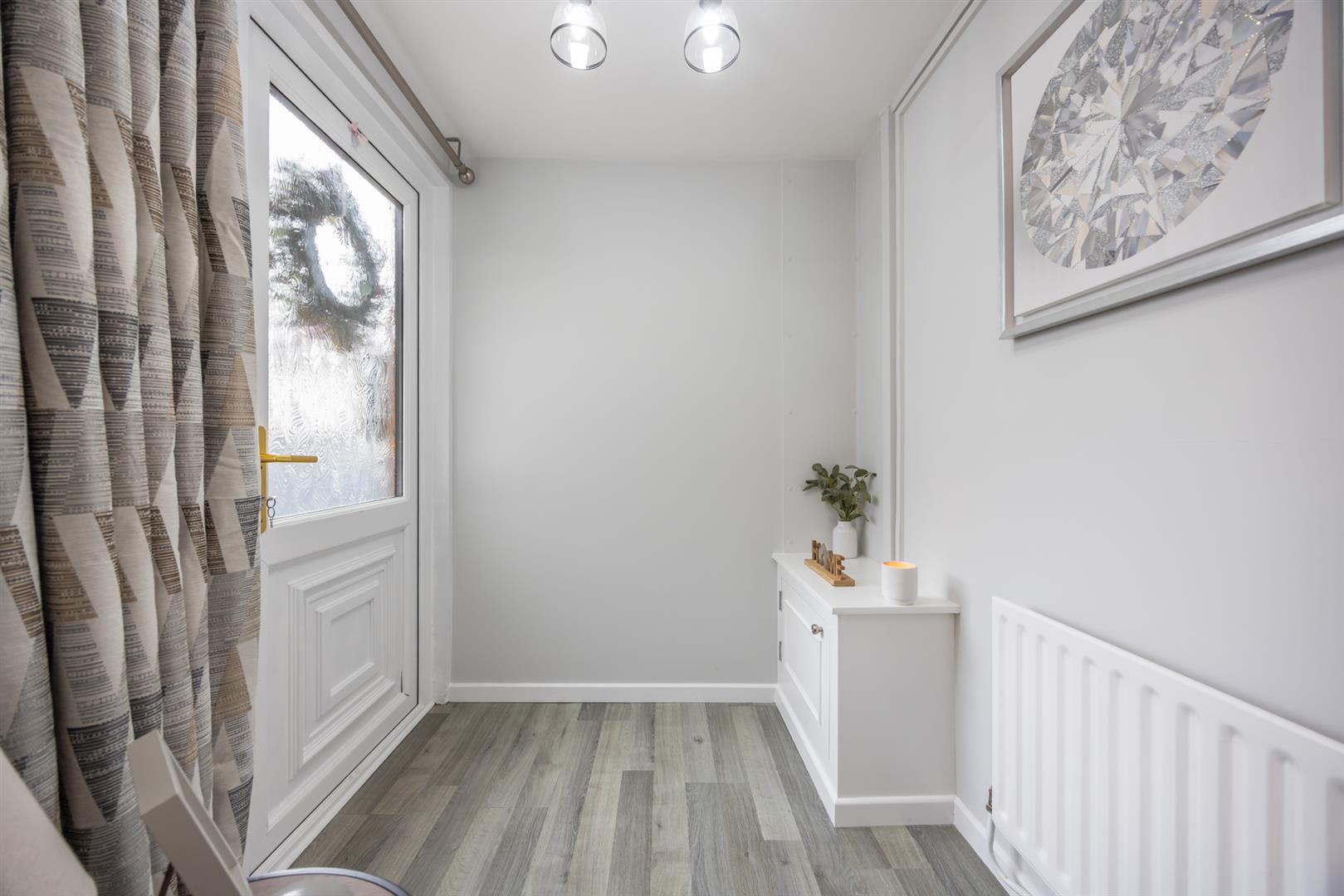 PVC double glazed front door with matching side screen. Wood laminate floor covering.