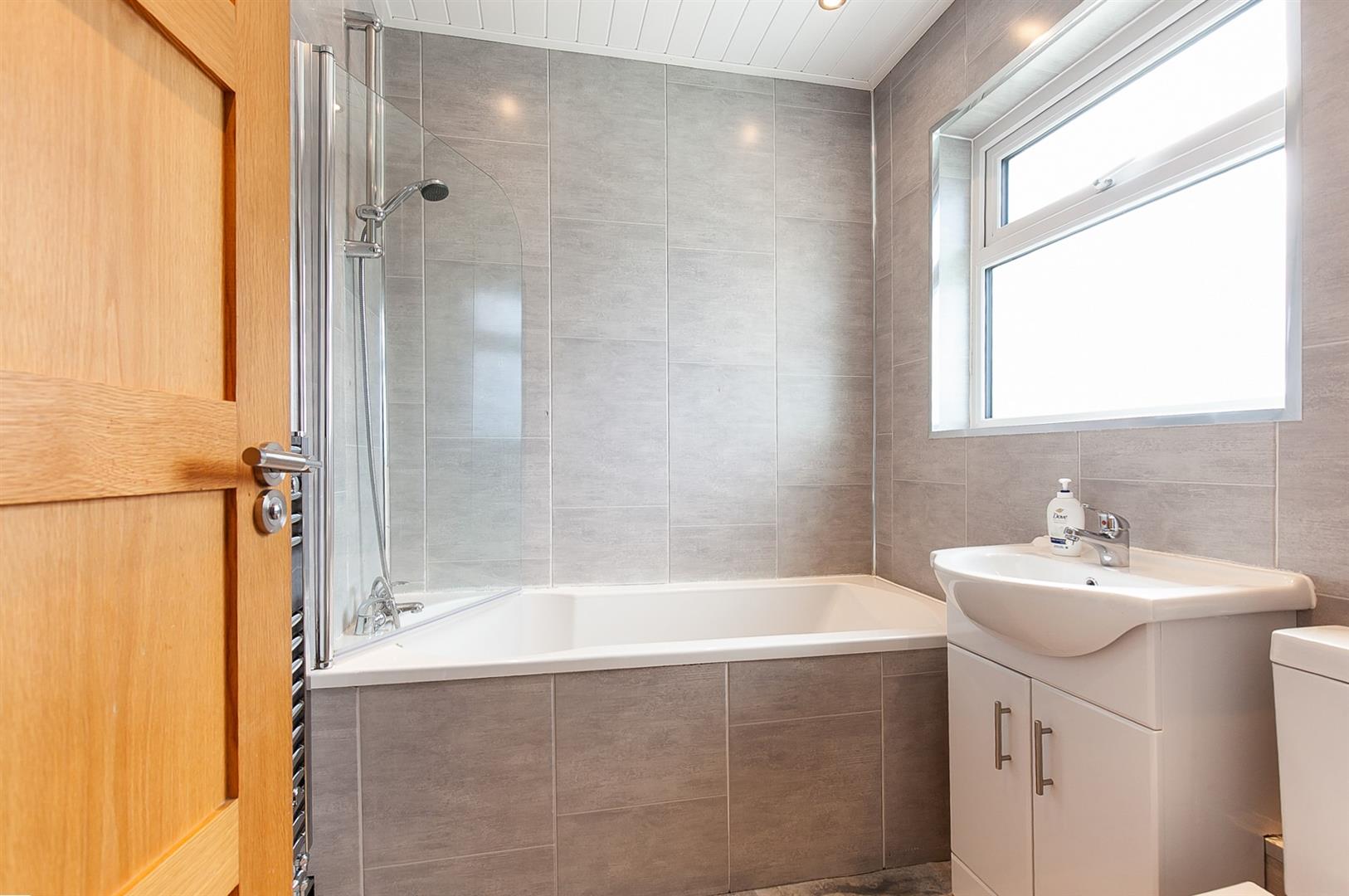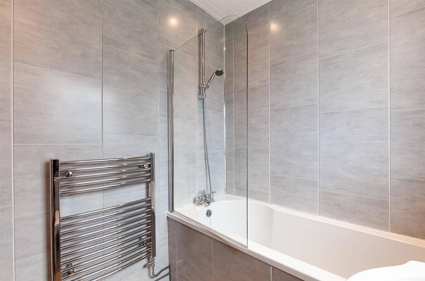 White, three piece suite comprising panelled bath, vanity unit and WC. Glass shower screen over bath. Tile effect panelling to walls. Chrome towel radiator.