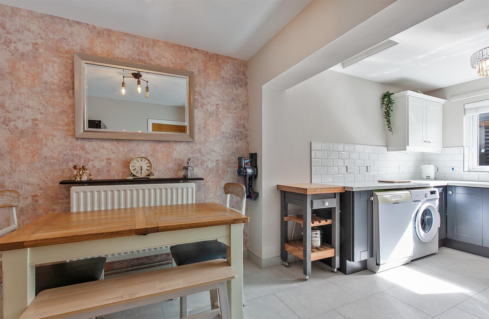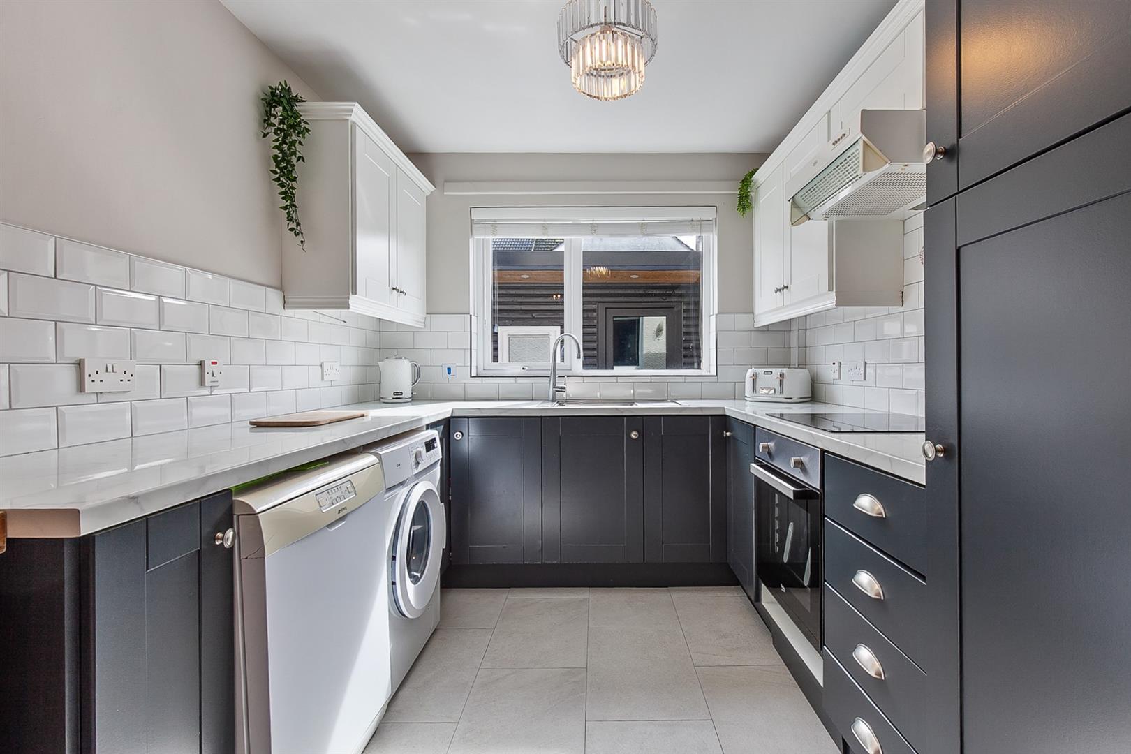 Modern, fitted kitchen with range of high and low level storage units with contrasting marble effect melamine work surface. Stainless steel sink unit with draining bay. Integrated touch screen ceramic hob with extractor hood over. Integrated oven. Plumbed and space for washing machine and dishwasher. Splashback tiling to walls. Tiled floor.