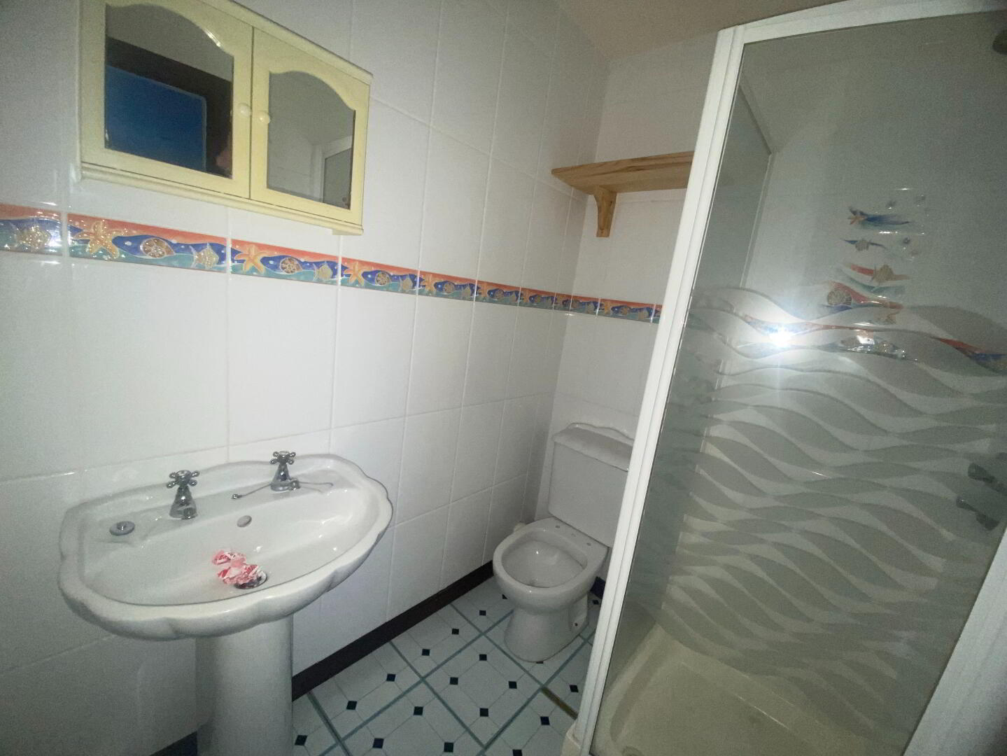 1.90m x 1.44m (6' 3" x 4' 9") 3 piece white suite comprising, low flush WC, pedestal wash hand basin, walk in shower cubicle, extractor fan, vinyl flooring, single panel radiator, tiled walls.