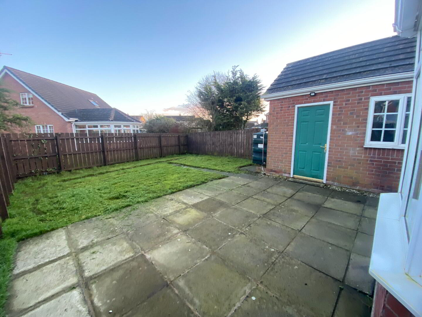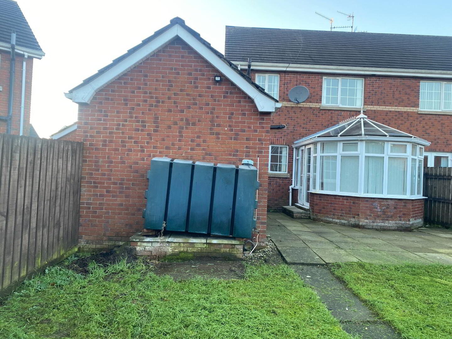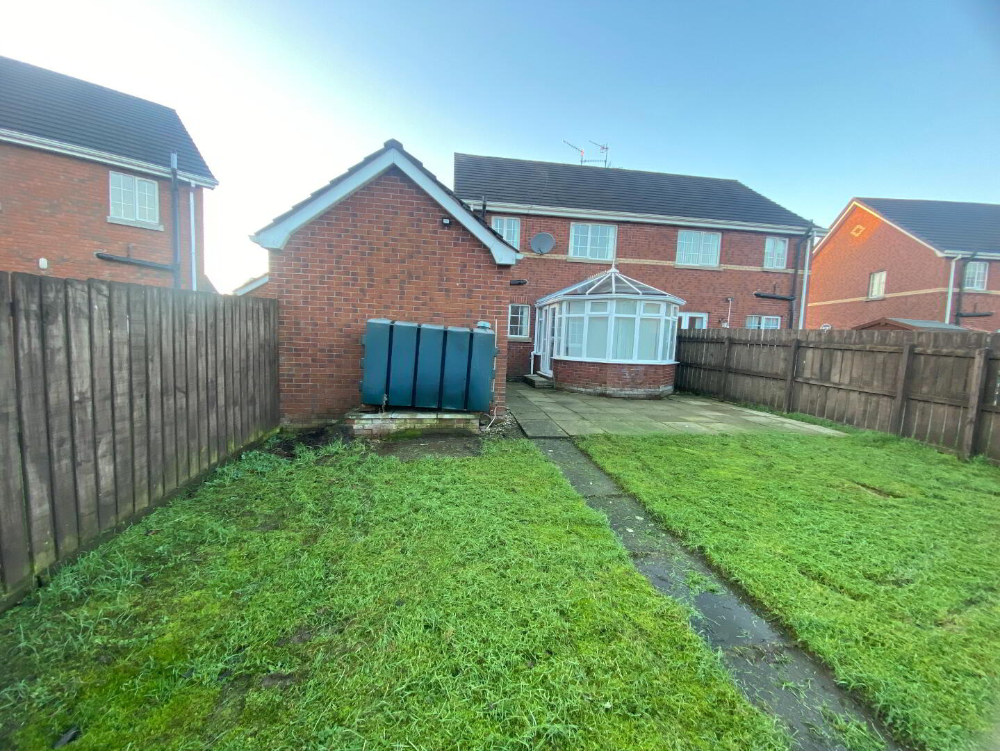Rear garden laid in lawn with paved patio area, PVC oil tank, outside tap, fully enclosed with timber fencing.