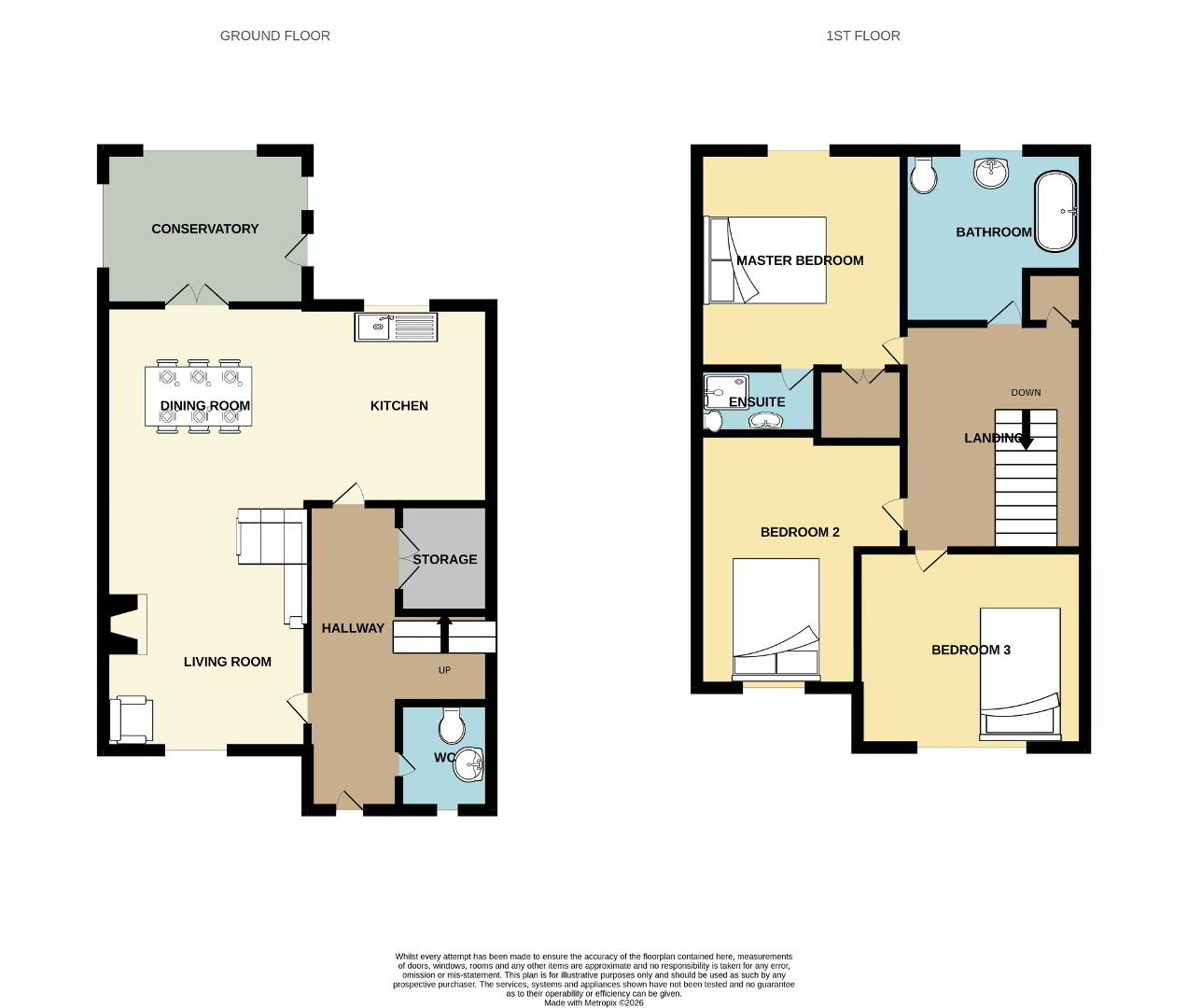 Upstairs, the property offers three well-proportioned bedrooms, with the master bedroom benefiting from an ensuite shower room. A family bathroom serves the remaining bedrooms, while a convenient downstairs WC adds to the practicality of the layout.