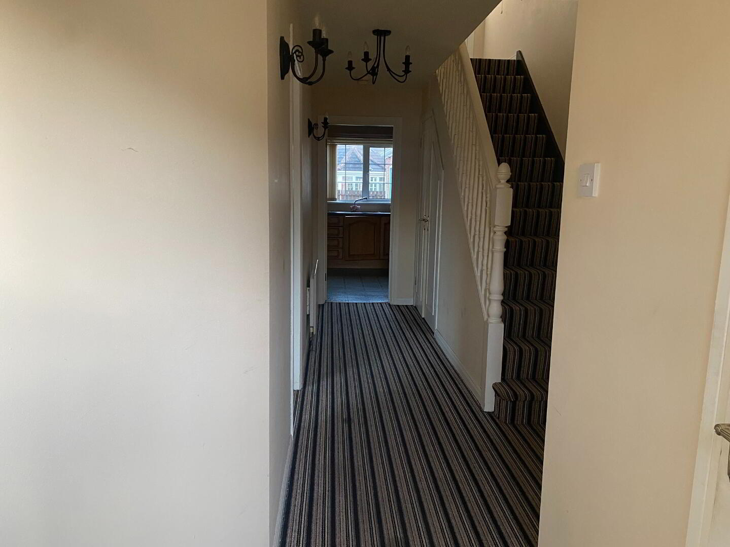 6.78m x 2.08m (22' 3" x 6' 10"furthest points) Brick paviour front step to front door. Carpet flooring, single panel radiator, wall lights, under stair built in robe, telephone point, staircase to first floor.