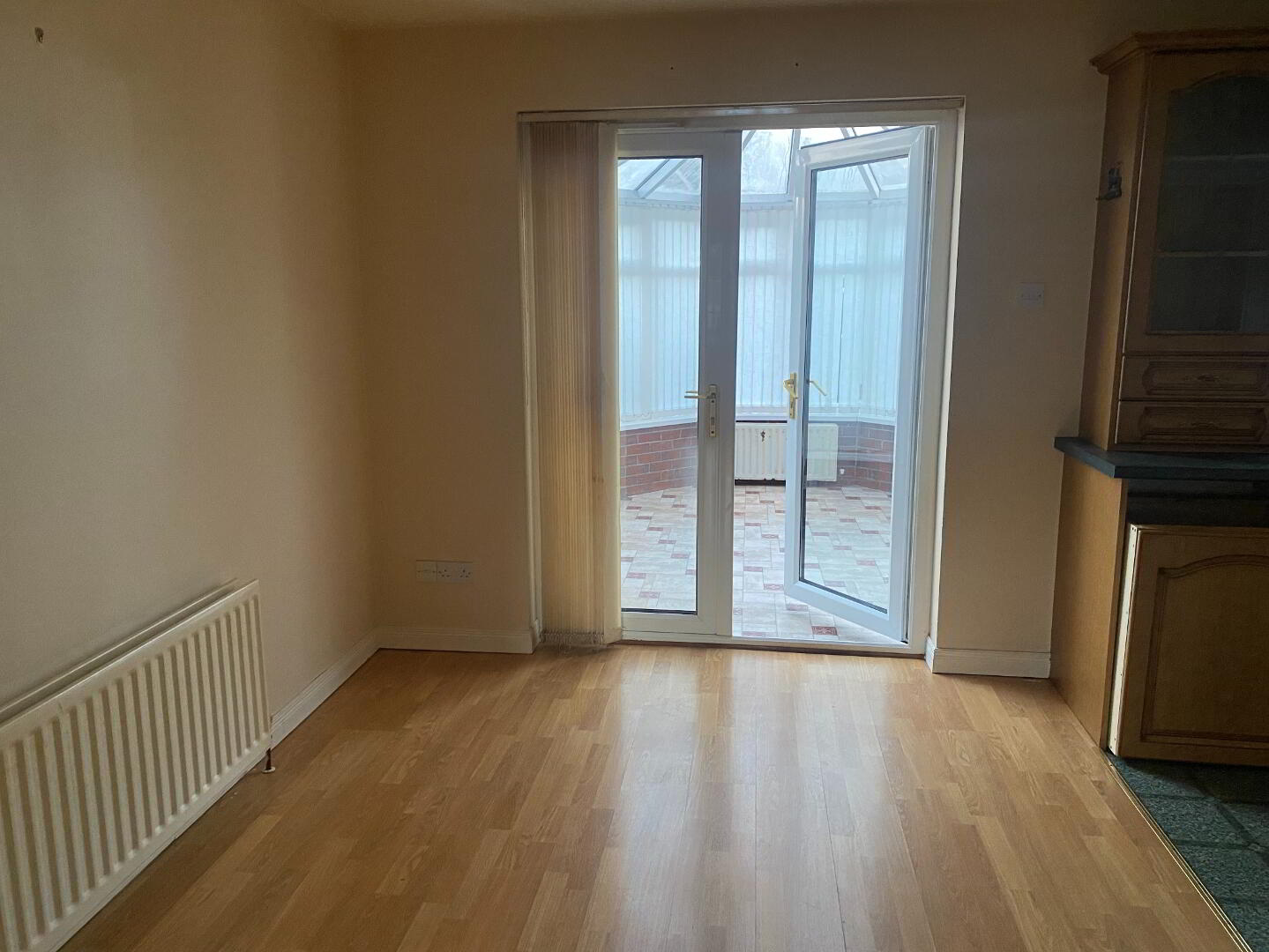 2.61m x 3.29m (8' 7" x 10' 10") Dining area with wood laminate flooring, double panel radiator, patio doors to Conservatory.