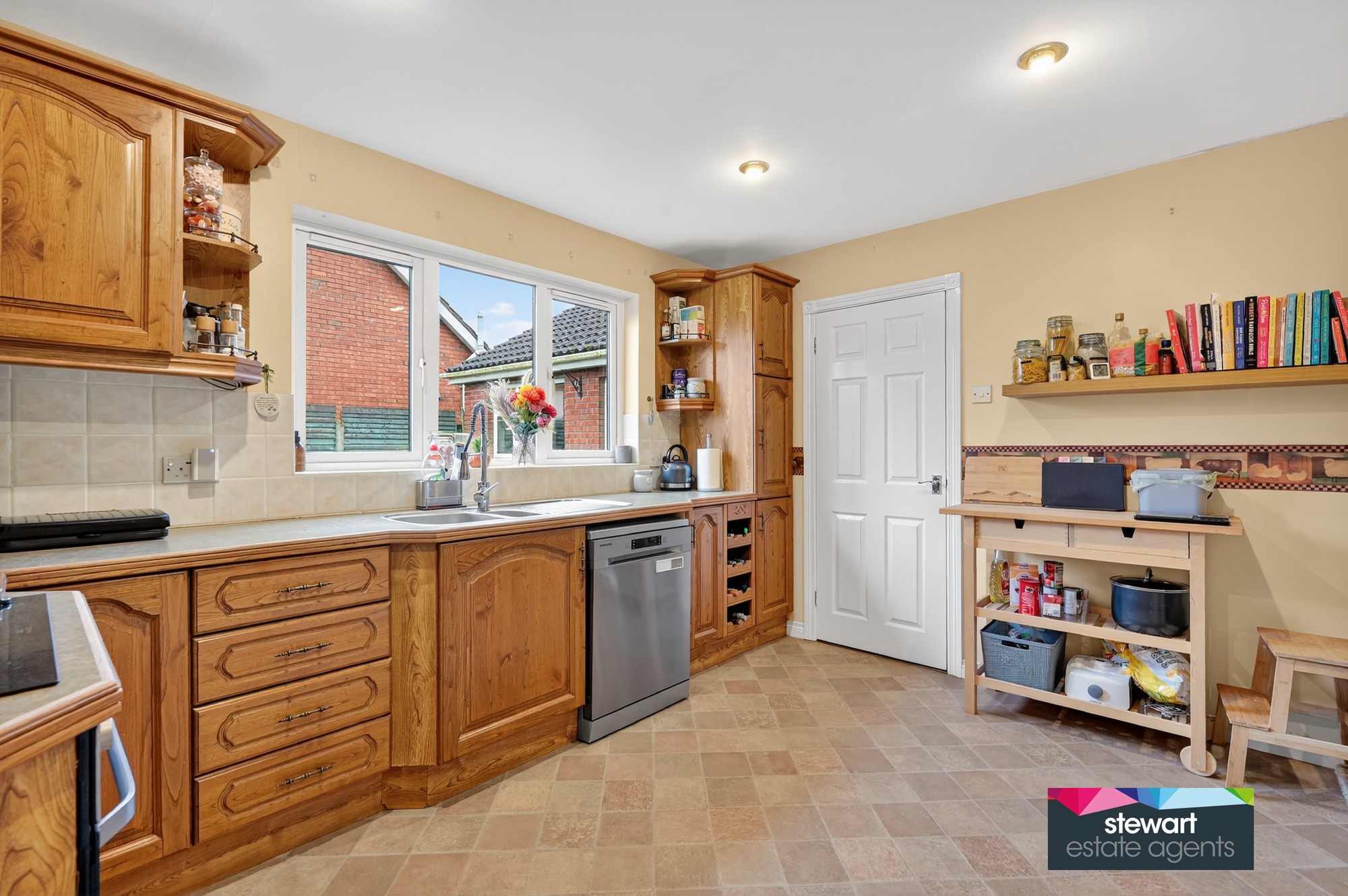 Kitchen with a good range of fitted high and low level kitchen cabinetry. Built in oven and inset hob. Extractor fan above. Space for a dish washer