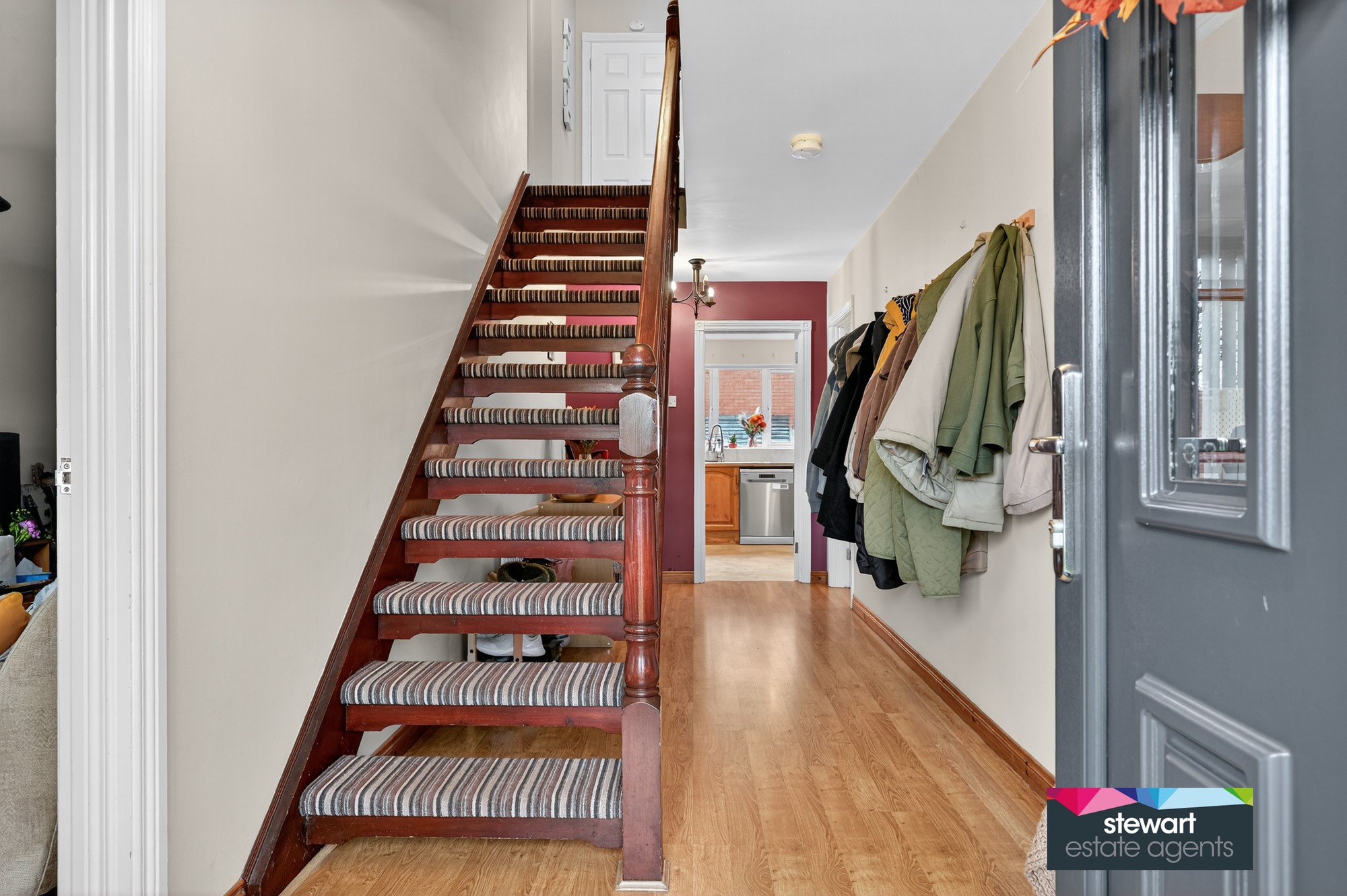 Bright and spacious hallway with a new PVC double glazed front door and matching side panels, spindled staircase to the first floor landing