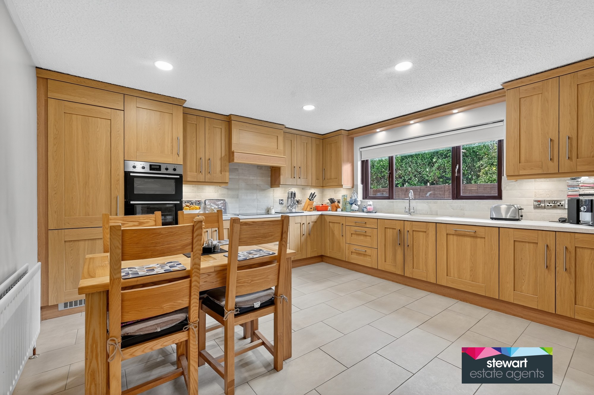Spacious kitchen with dining area having a newly fitted bespoke fitted contemporary style range of high and low level units finished in a shaker style oak and including a built in double oven, inset hob with extractor fan above. Built in fridge/freezer, built in dish washer, attractive tiled floor