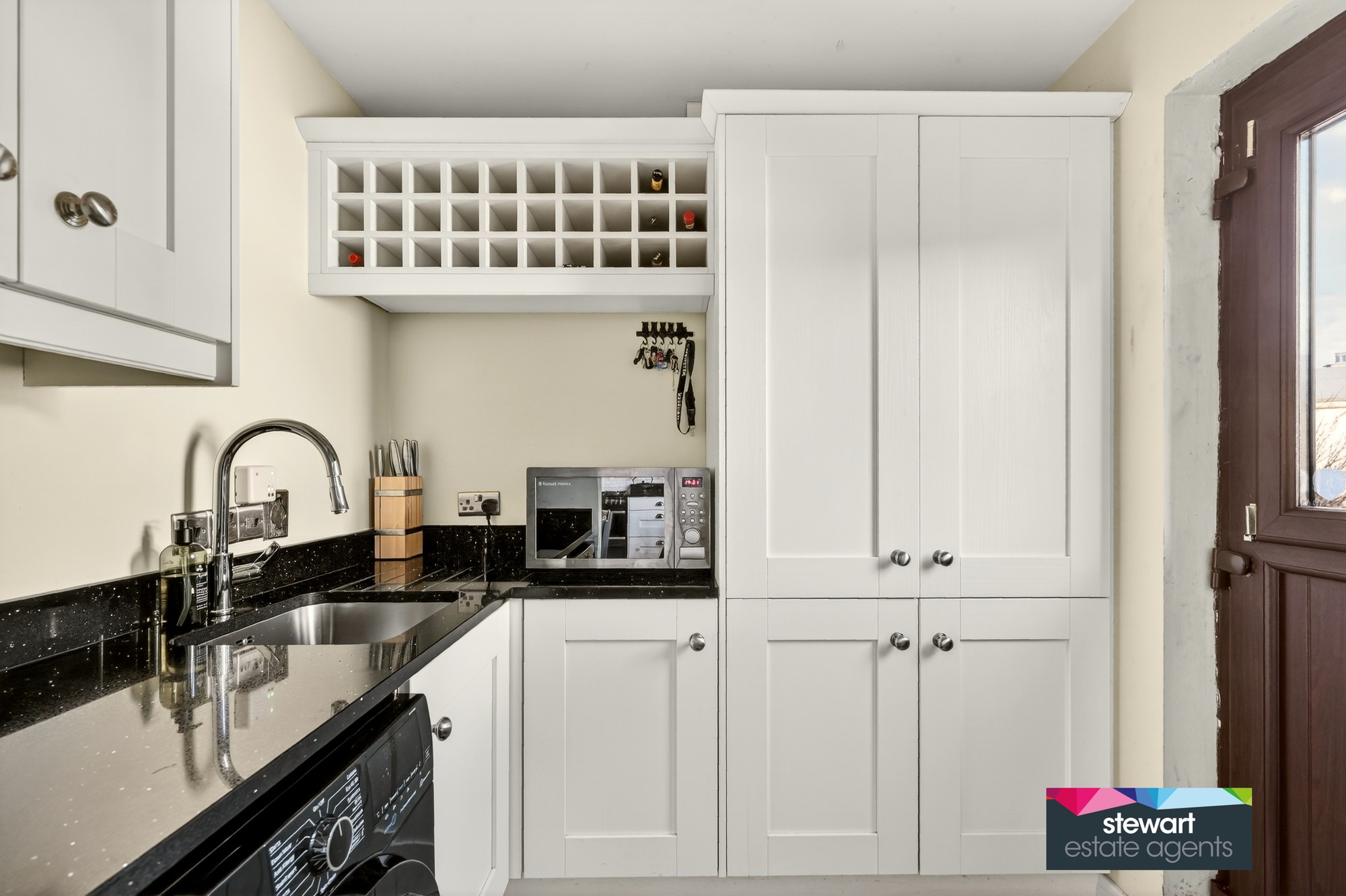 Open plan to the utility room with fitted high and low level units with an integrated wine rack, fitted granite work surfaces and space for a washing machine