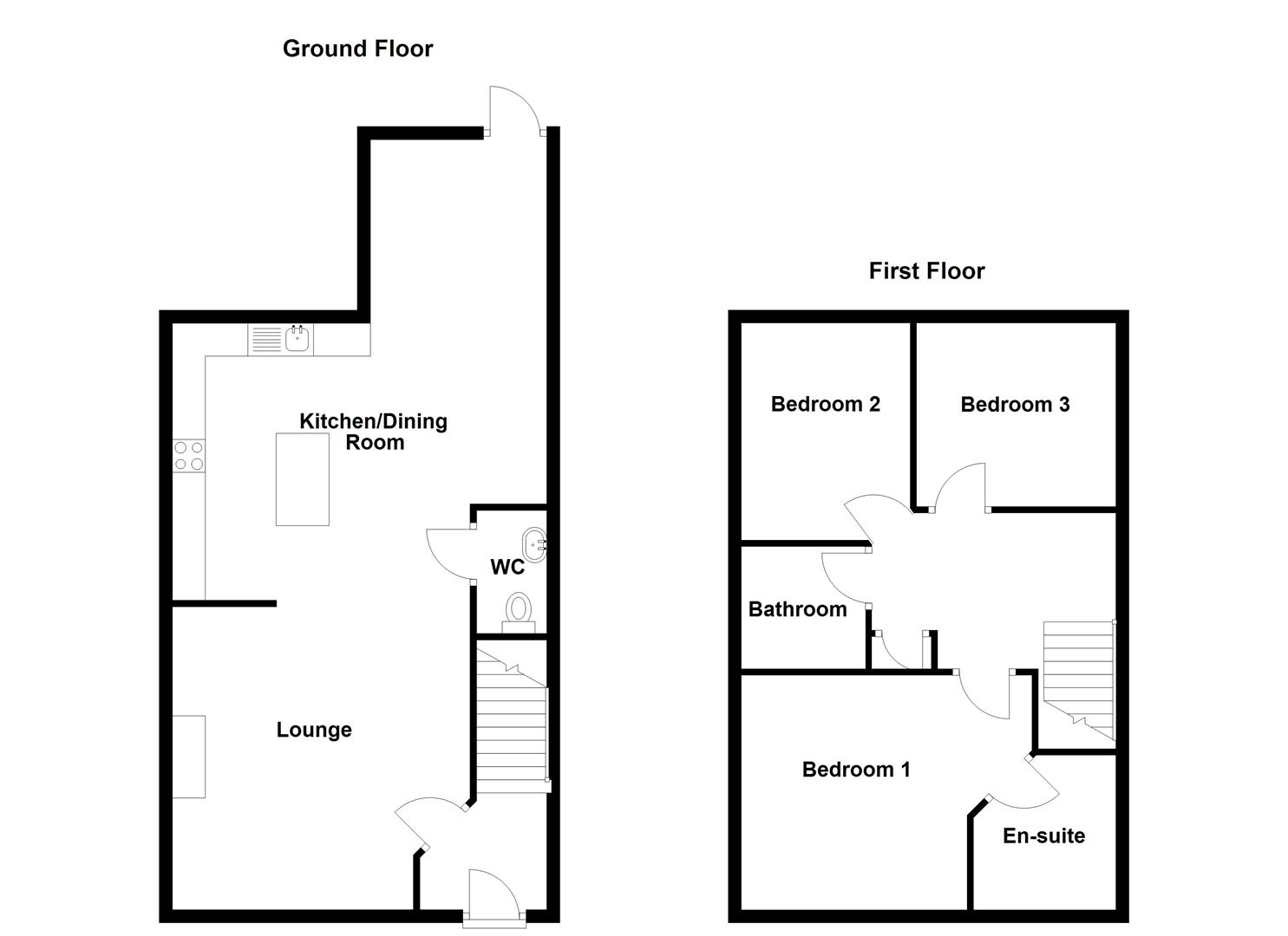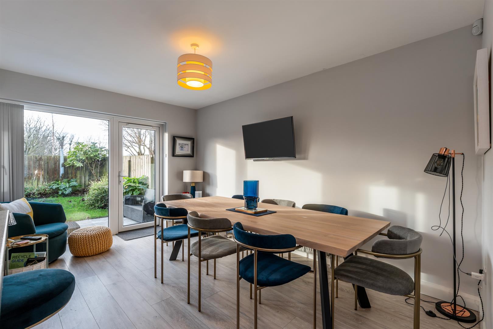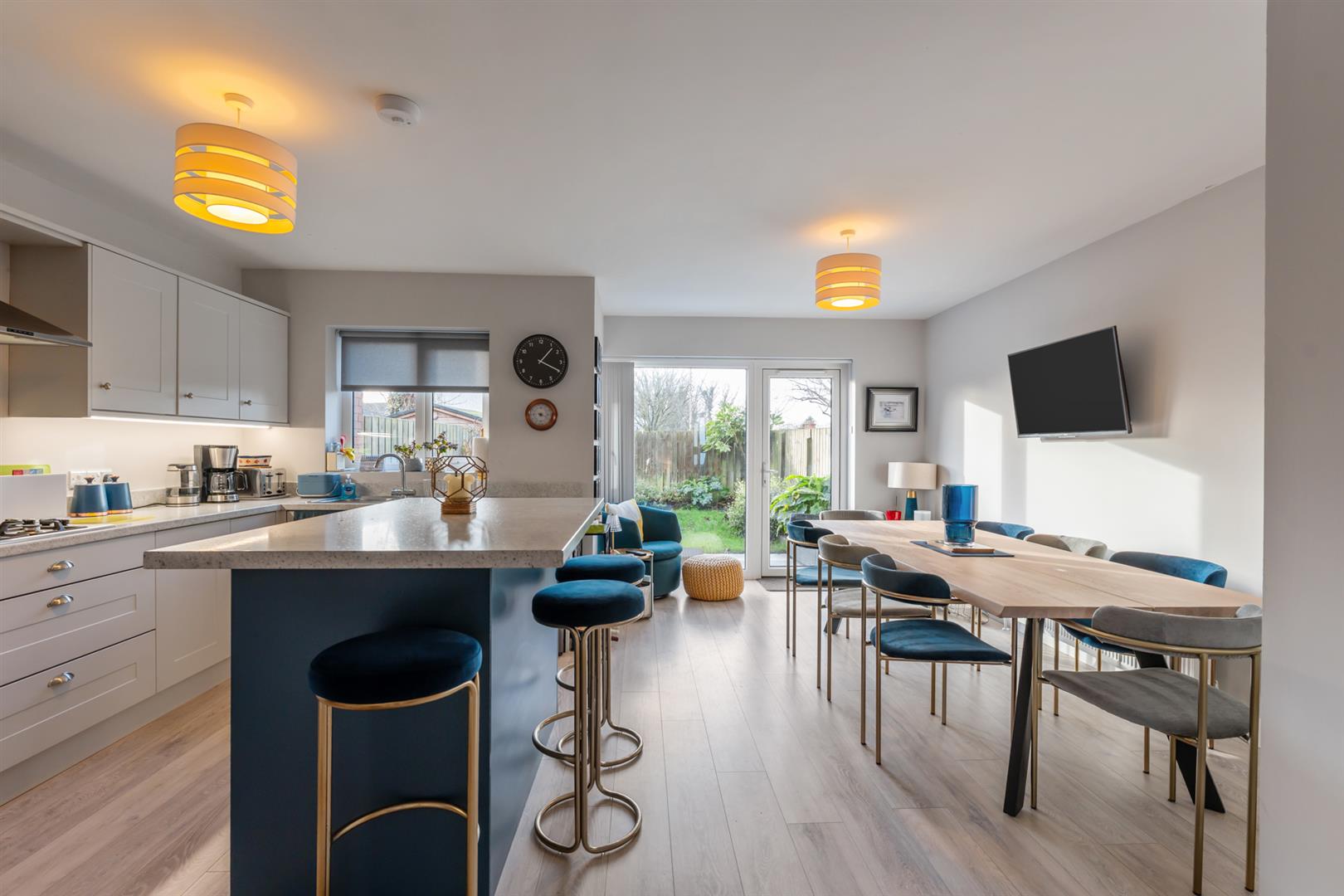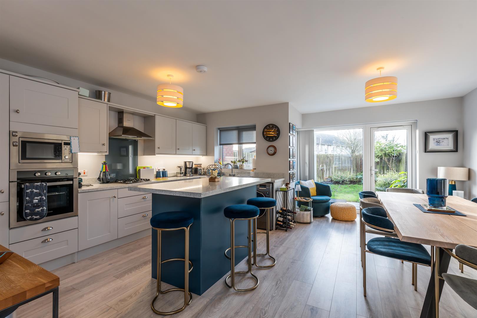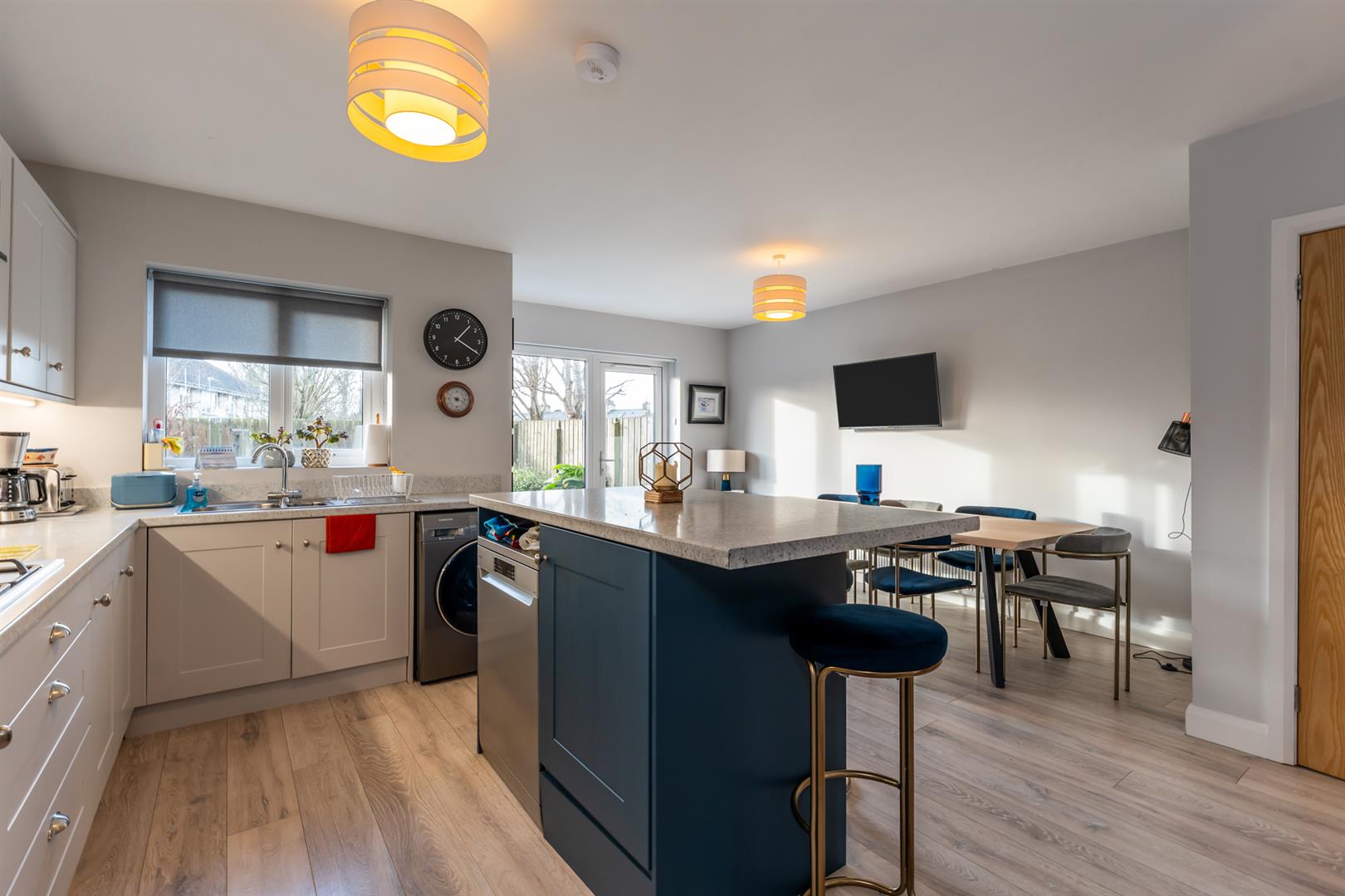 The ground floor includes an entrance hall leading to a bright lounge with a wood burning stove, creating a warm focal point. This opens into a spacious kitchen and dining area fitted with modern units, integrated appliances, a breakfast island and ample space for family dining. A ground floor WC adds further practicality.