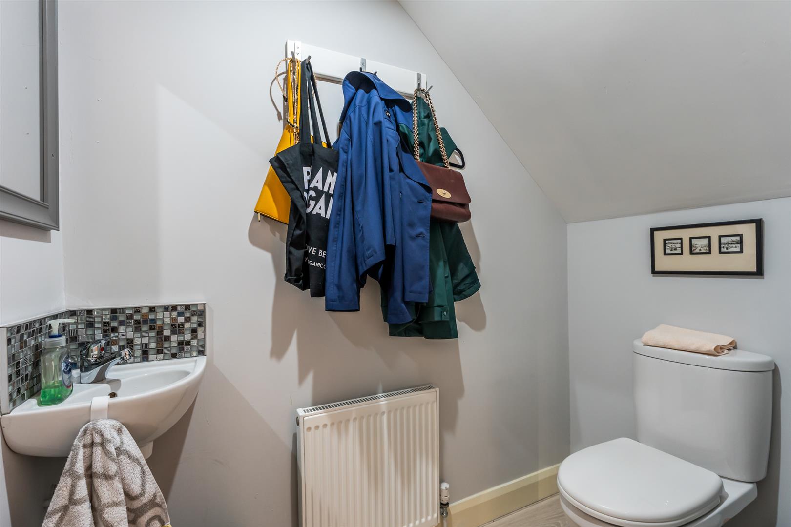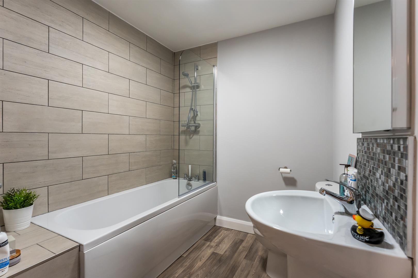 Modern white suite, wash hand basin with mixer tap, tile splashback, low flush w/c, wood laminate flooring, recessed spotlighting, extractor fan.