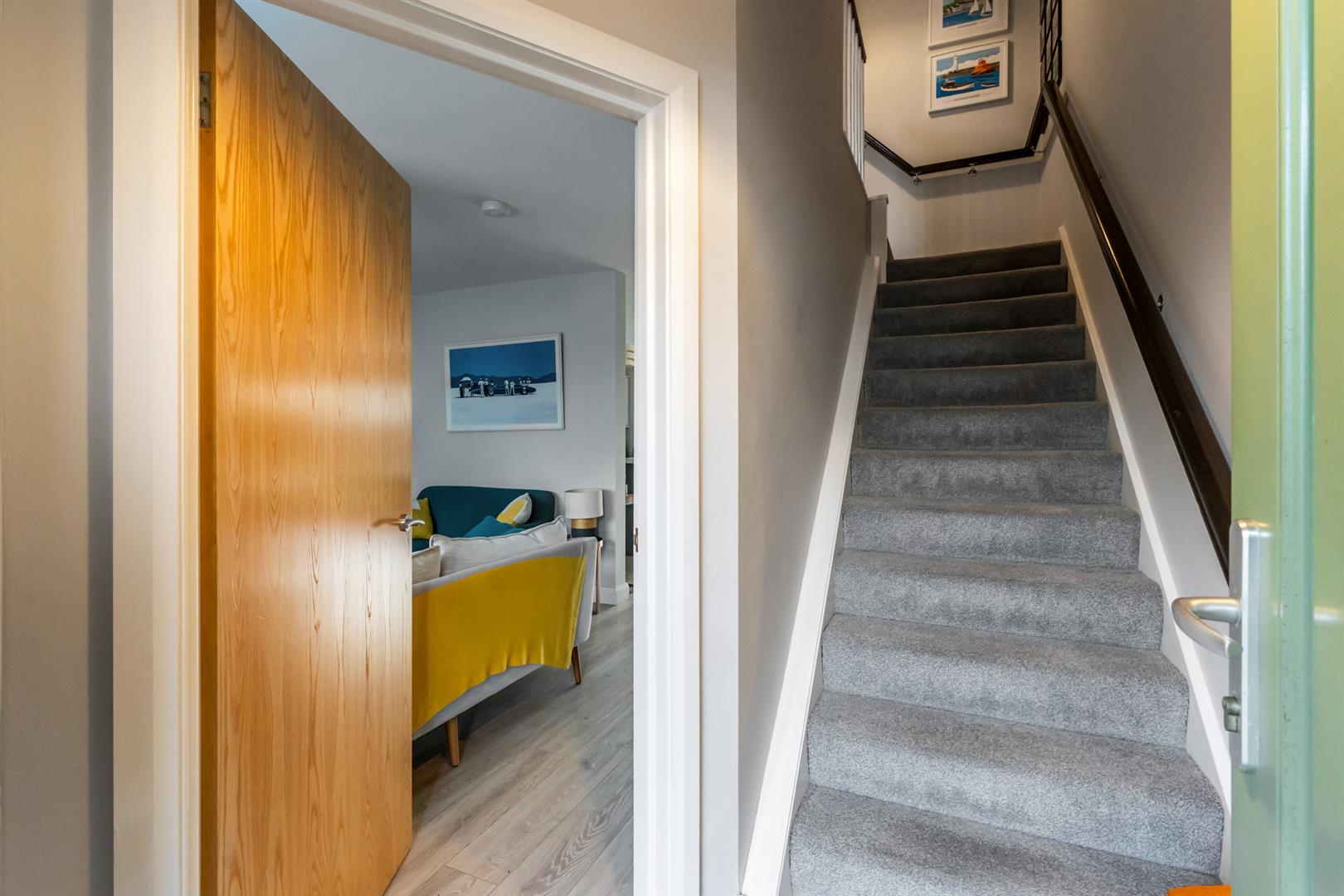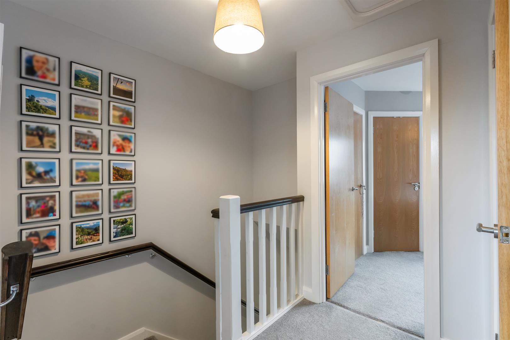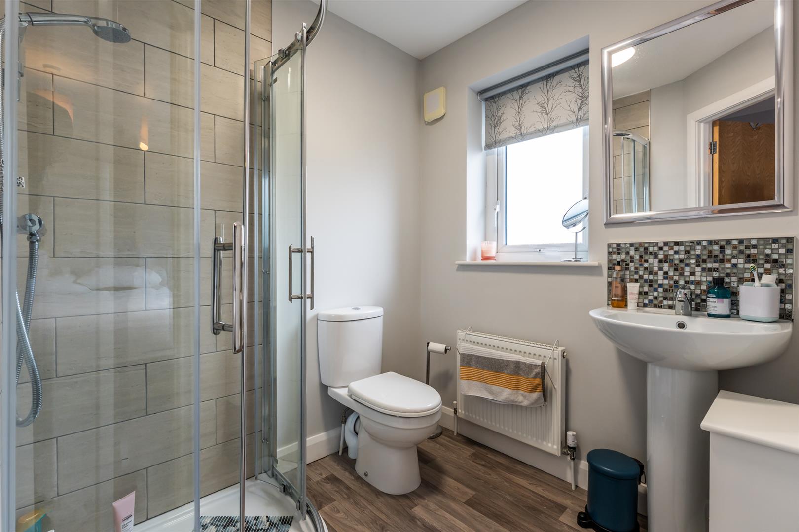 Upstairs, the main bedroom includes built-in wardrobes and a private ensuite shower room. Two additional bedrooms offer flexibility for family, guests or a home office. The main bathroom is finished with a modern white suite and built-in shower.