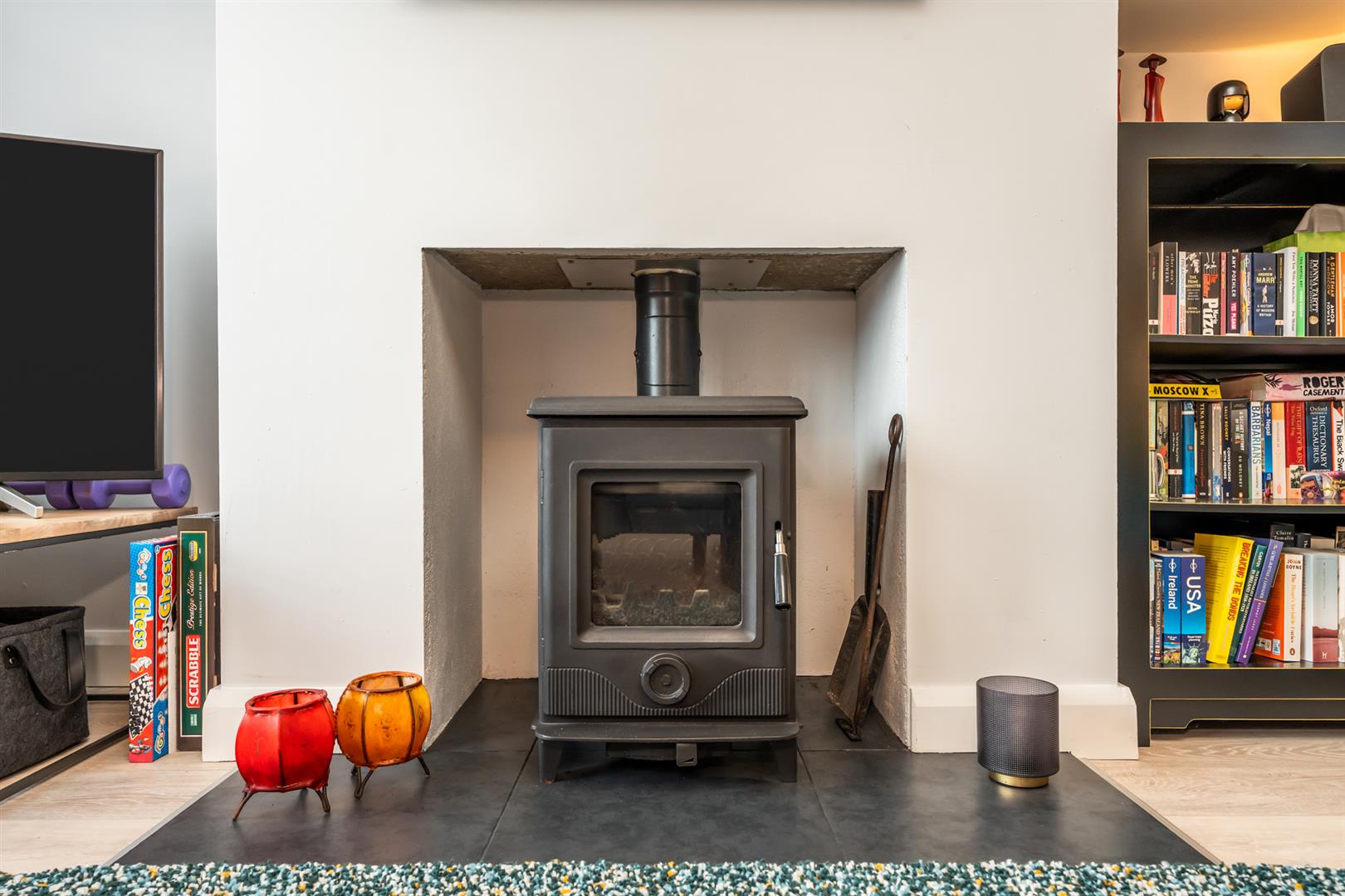 Hole in wall fireplace with wood burning stove, tiled hearth, wood laminate flooring. open to: