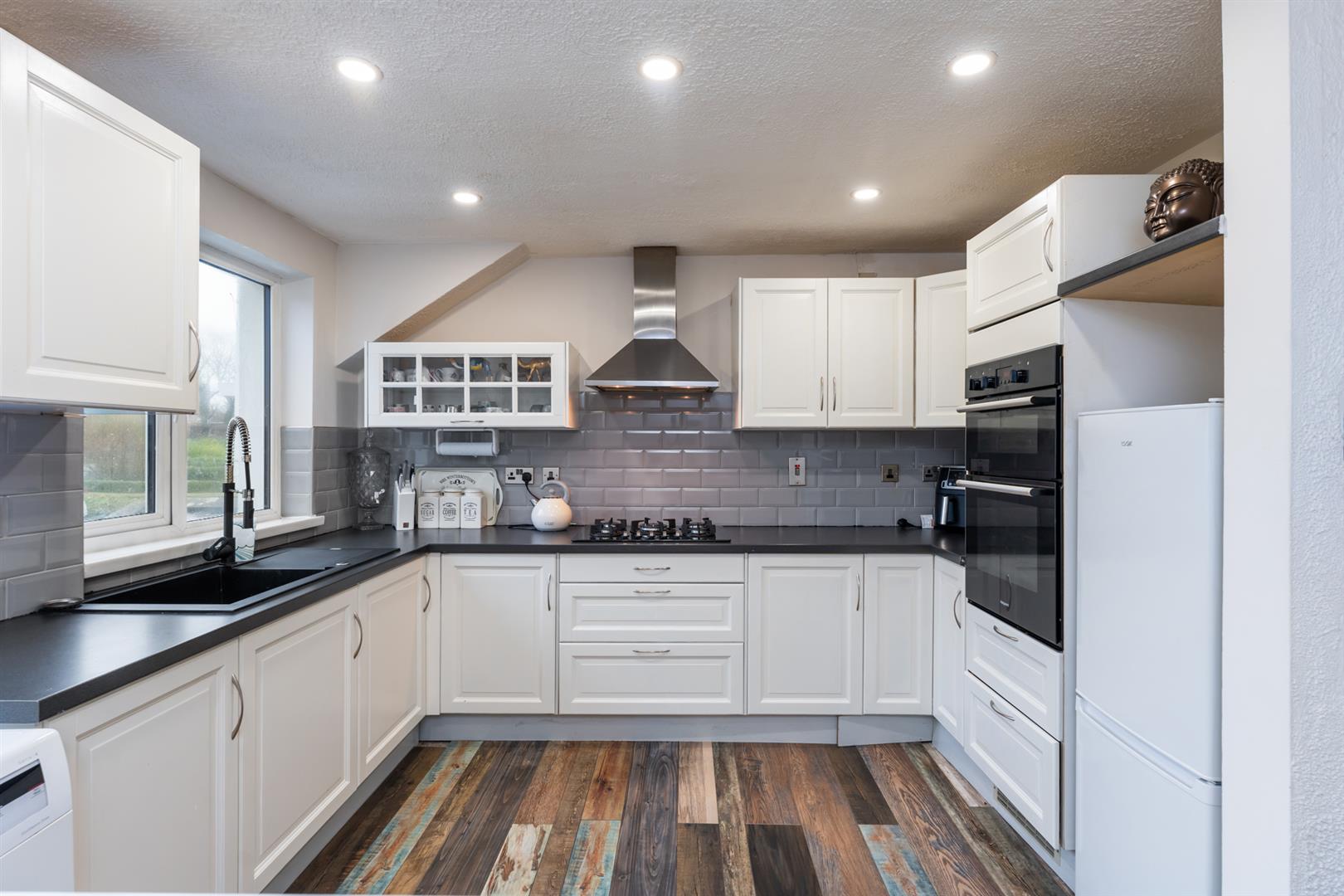 Modern range of high and low level units including display cabinet, granite effect work surfaces, inset single drainer sink unit with hose tap, double built in oven, five ring gas hob with stainless steel extractor hood, space for fridge freezer, plumbed for washing machine, partly tiled walls, wood laminate flooring and recessed spotlighting.