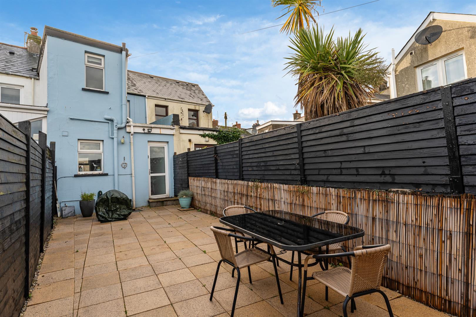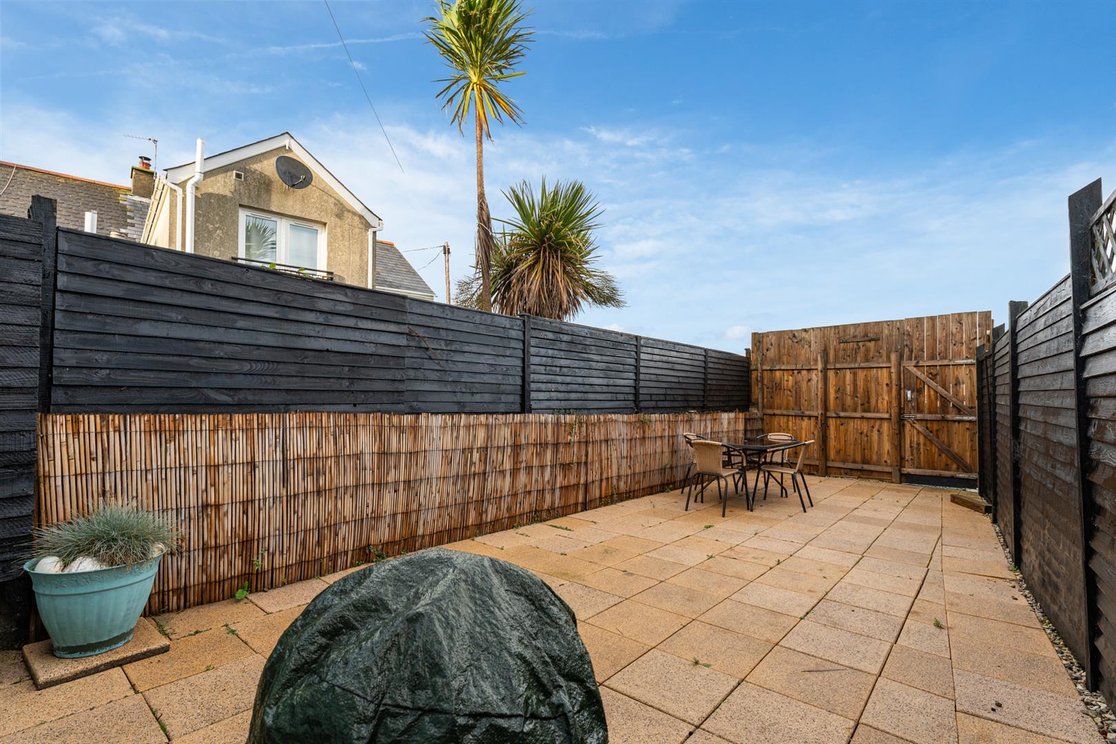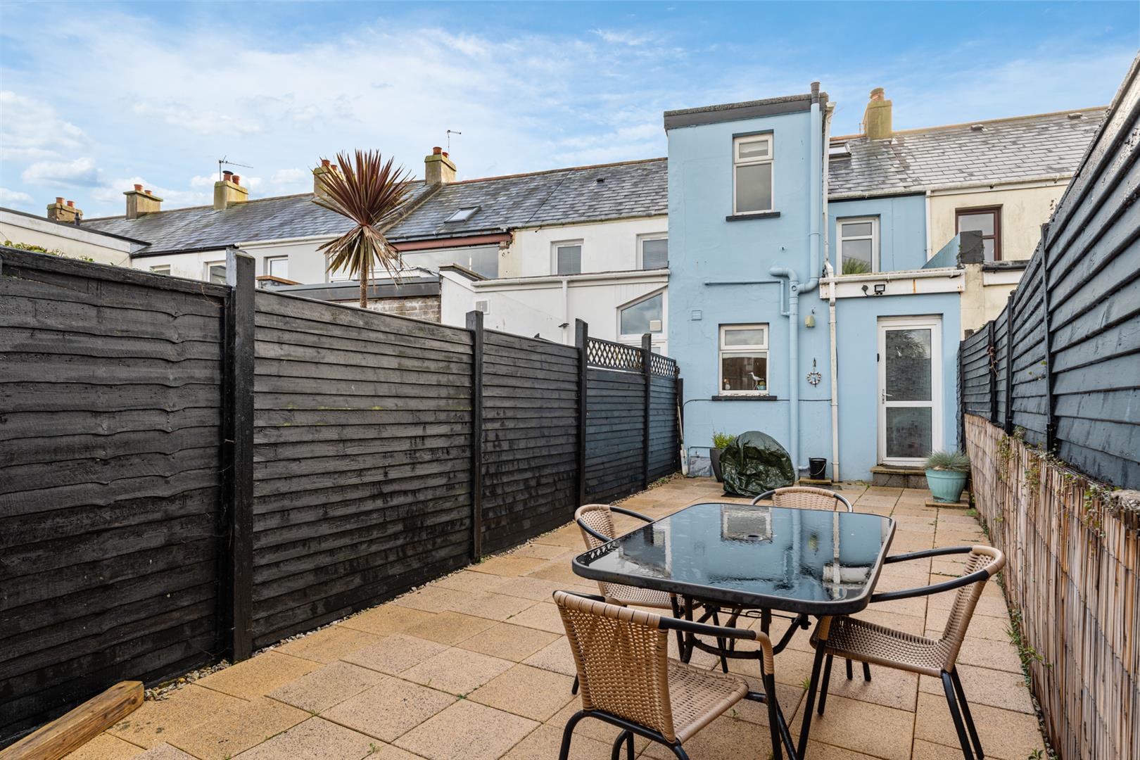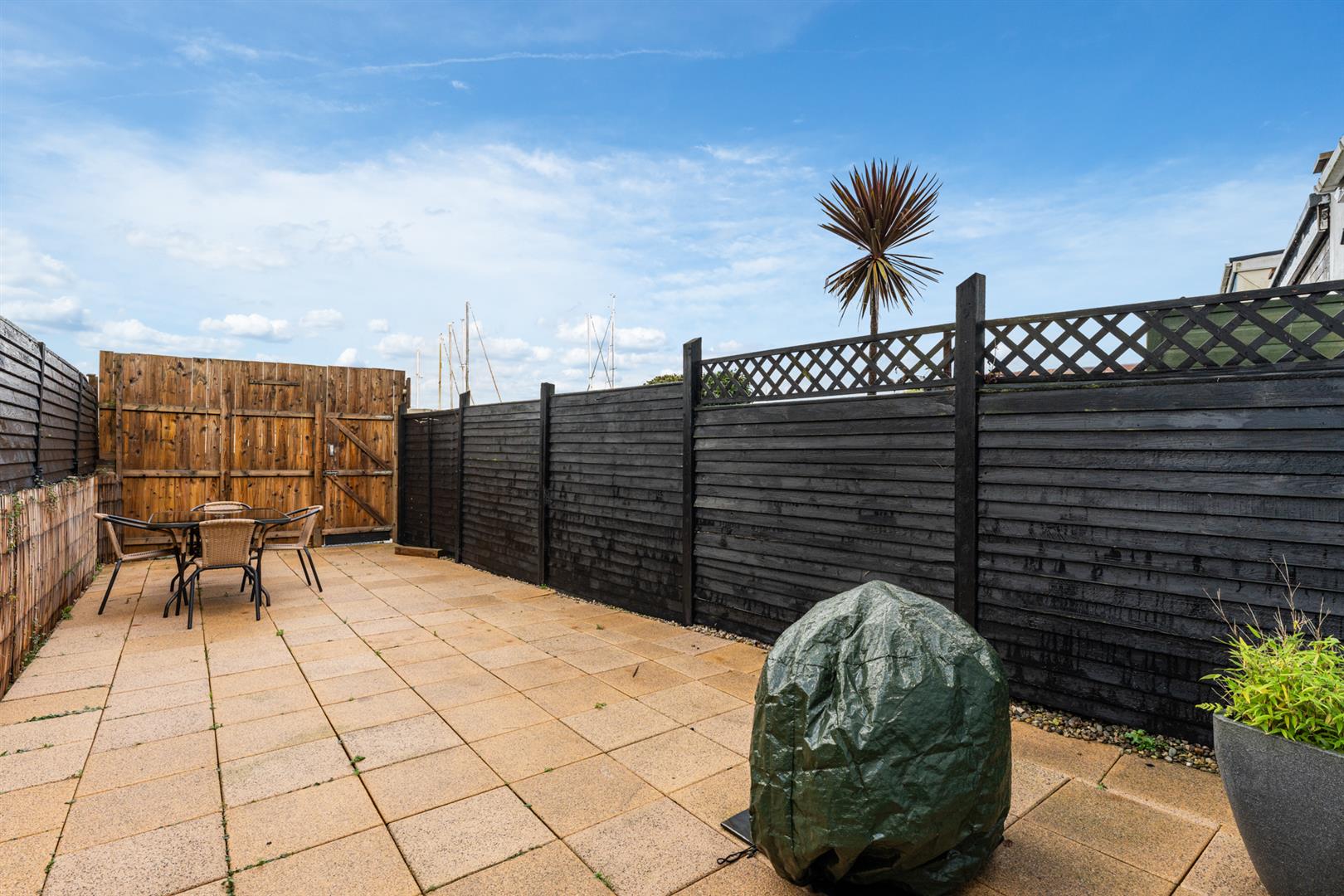 Rear - Fully enclosed, area fully paved, outside tap and light, rear gate for bin access and direct access onto the Commons car park.