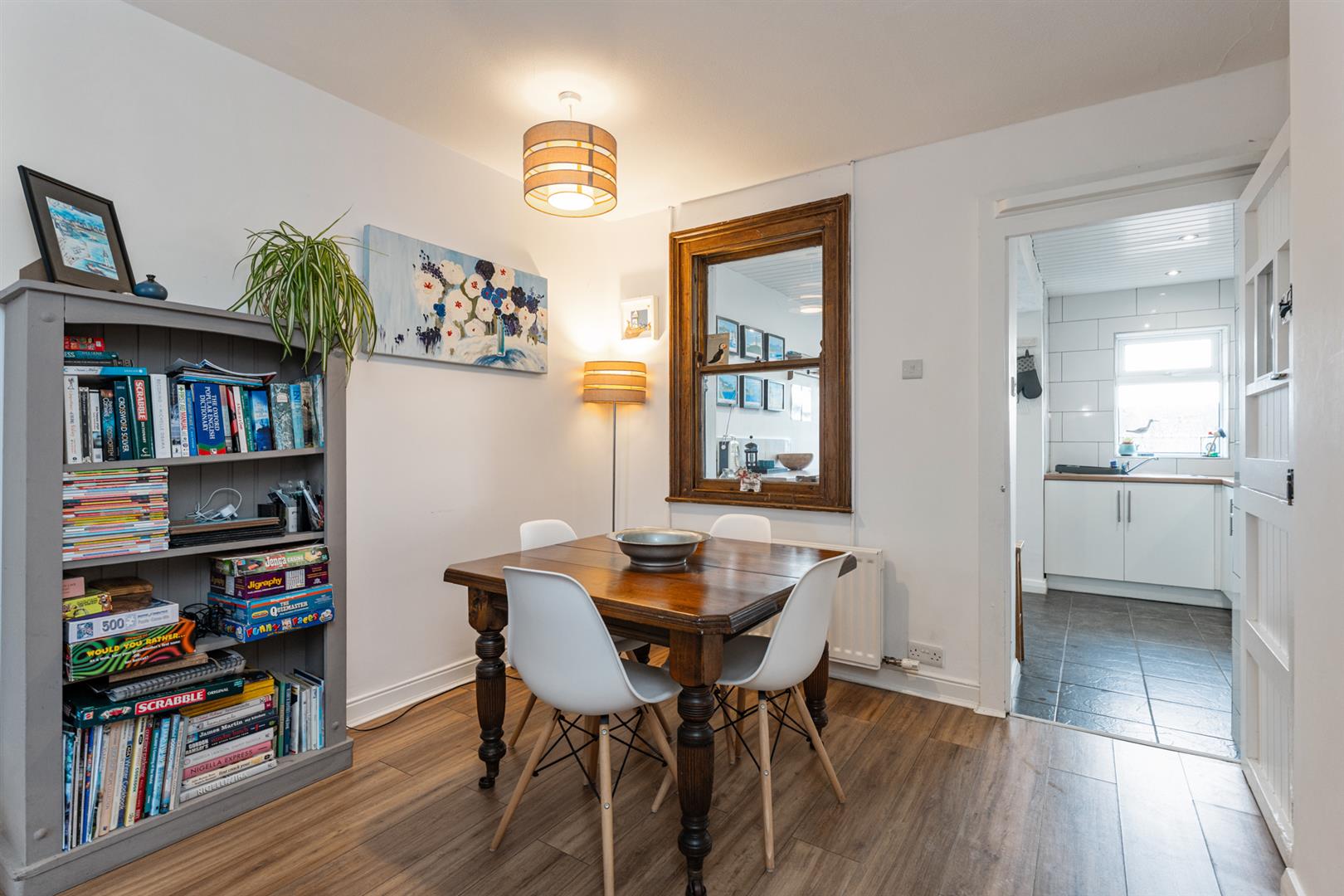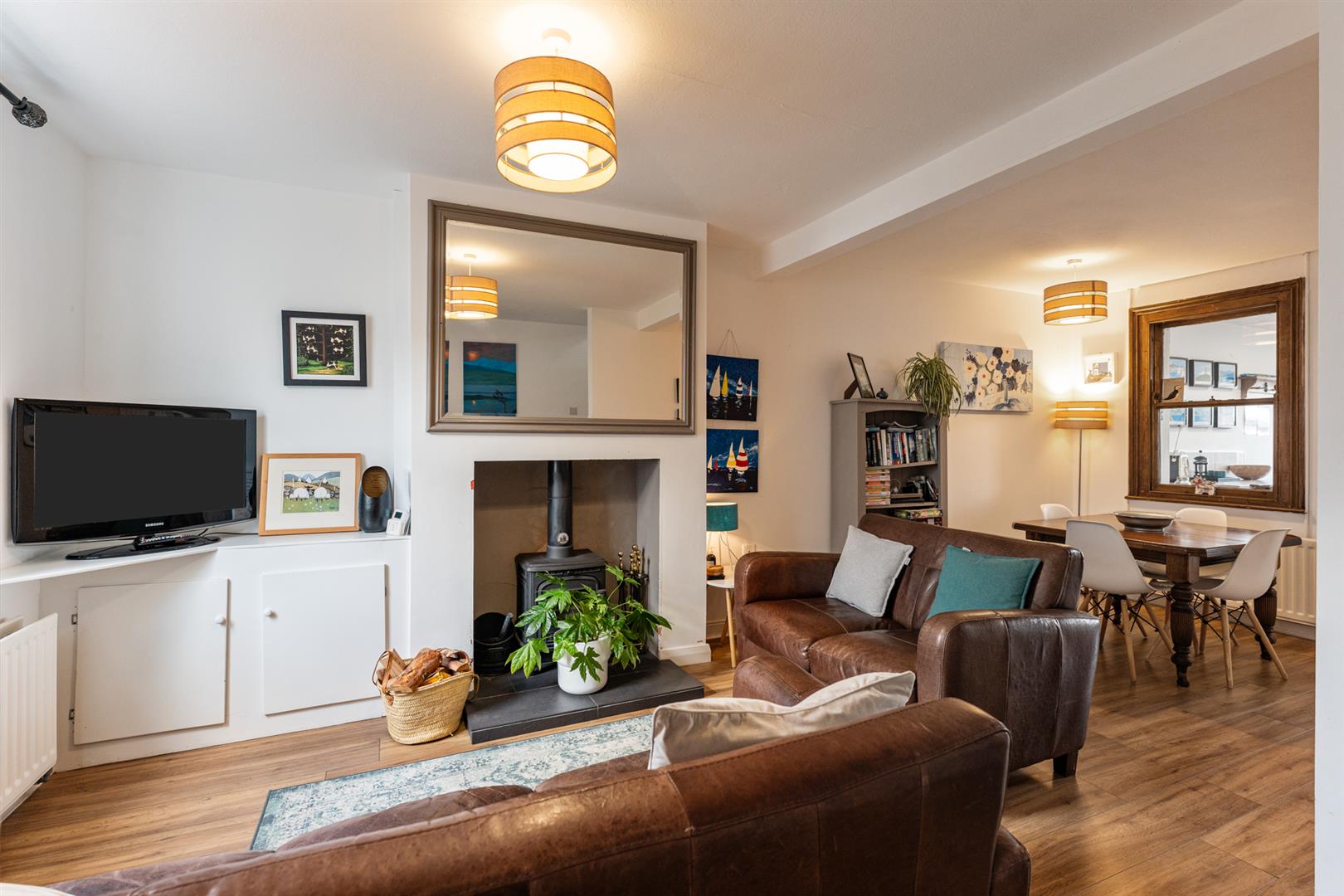 Wood burning stove with tiled hearth, space for dining, wood laminate flooring and storage under the stairs.