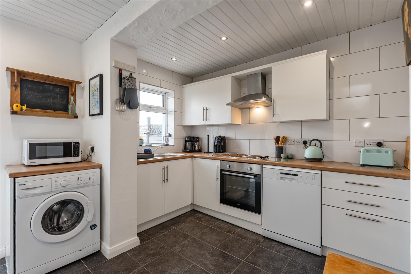 Fitted kitchen with range of high and low level units, laminate effect work surfaces, single stainless steel sink with mixer tap and drainer, integrated appliances to include; four ring electric hob, oven, stainless steel extractor hood and dishwasher, plumbed for washing machine, dishwasher, space for fridge freezer, tiled flooring, part tiled walls, recessed spotlights, back door to enclosed door to enclosed rear yard.