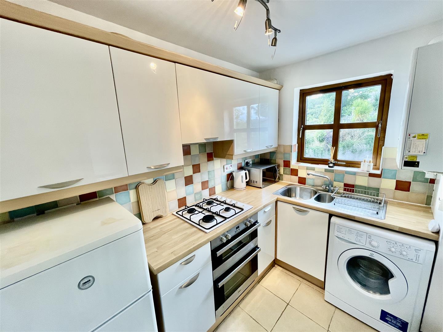 Range of high and low level units, laminate work surfaces, four ring gas hob, integrated oven and grill, integrated extractor fan, one and a quarter stainless steel sink with mixer tap and drainer, plumbed for washing machine, space for fridge/freezer, tiled floor, part tiled walls, gas fired boiler.