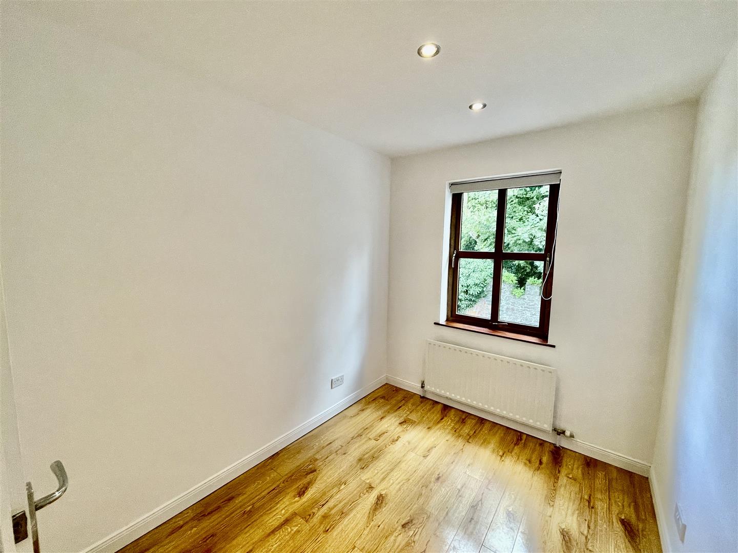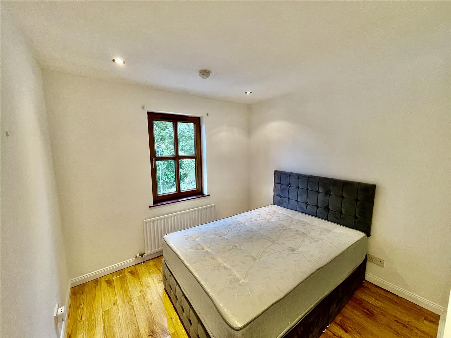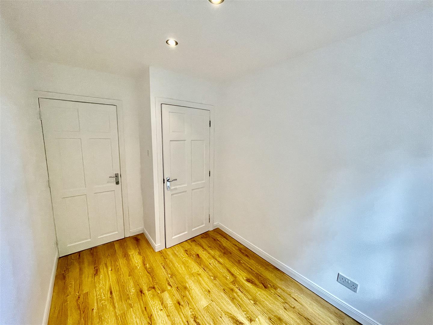 Double bedroom with built in storage, wood laminate floor, recessed spotlights.