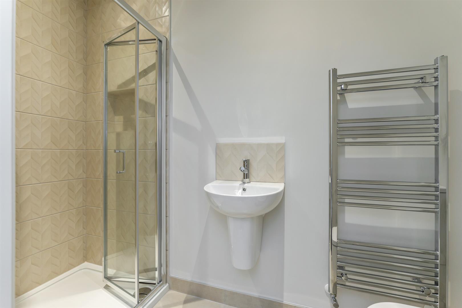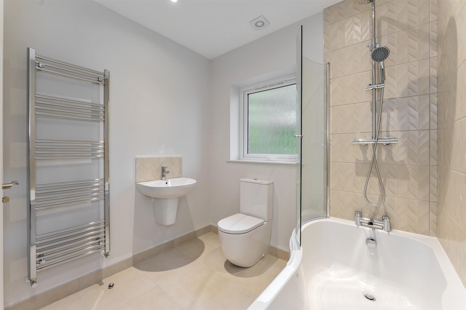 Full height tiling around the bath, shower over bath and glass shower screen where shower bath applies