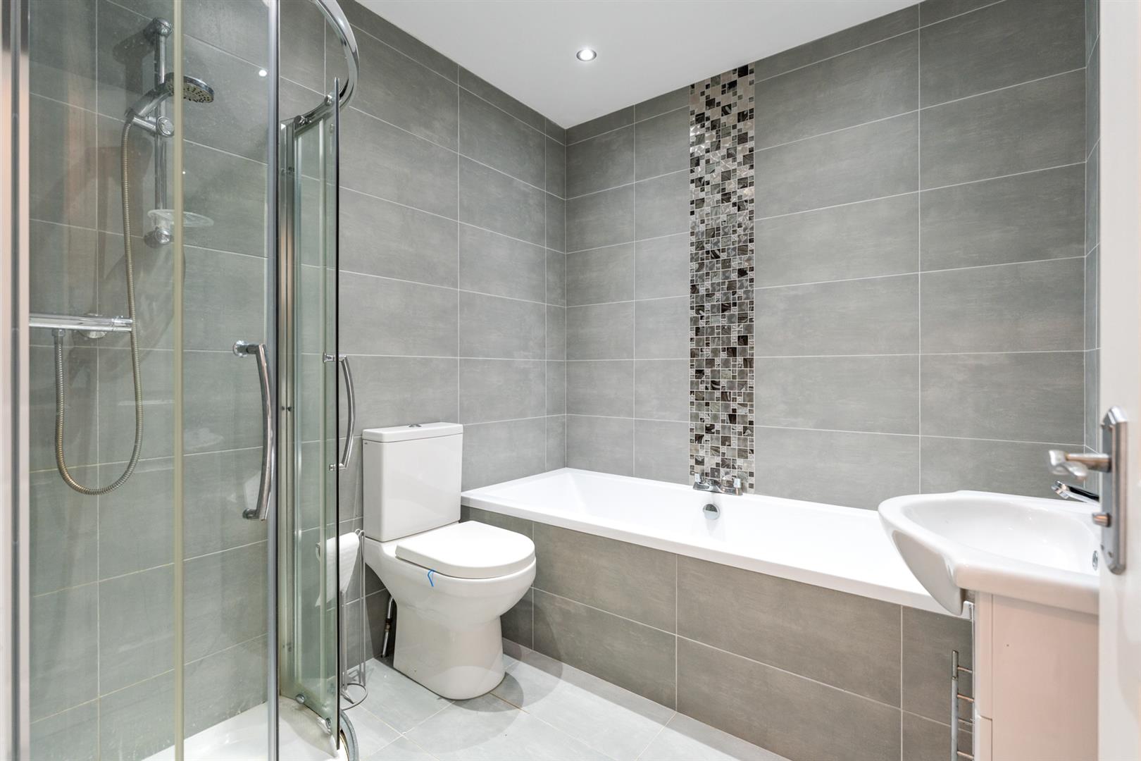 White suite comprising panelled bath with mixer tap, low flush wc, corner shower with overhead shower and glazed doors, vanity unit with sink, storage and mixer tap, heated towel rail, tiled flooring, recessed spotlighting, extractor fan.