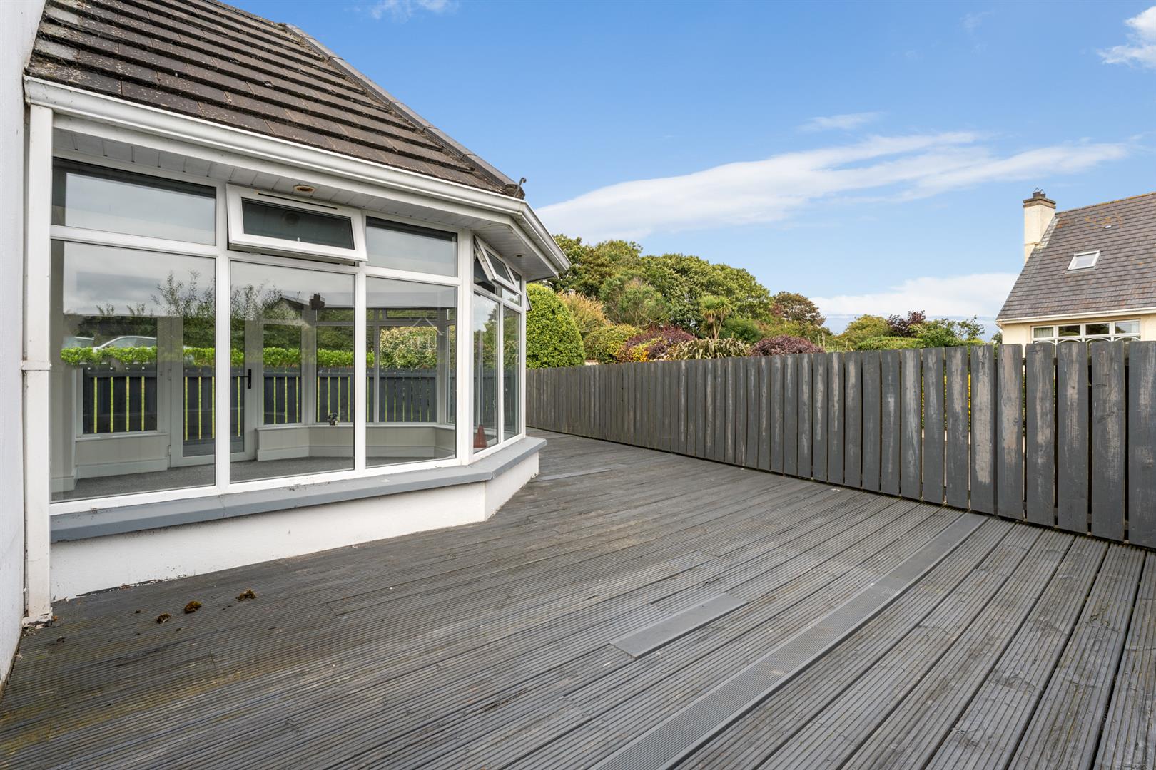 Side and Rear: areas in lawn, mature hedging and trees, decked entertaining area, tap and light, space for shed, side gate for bin access and sea views.