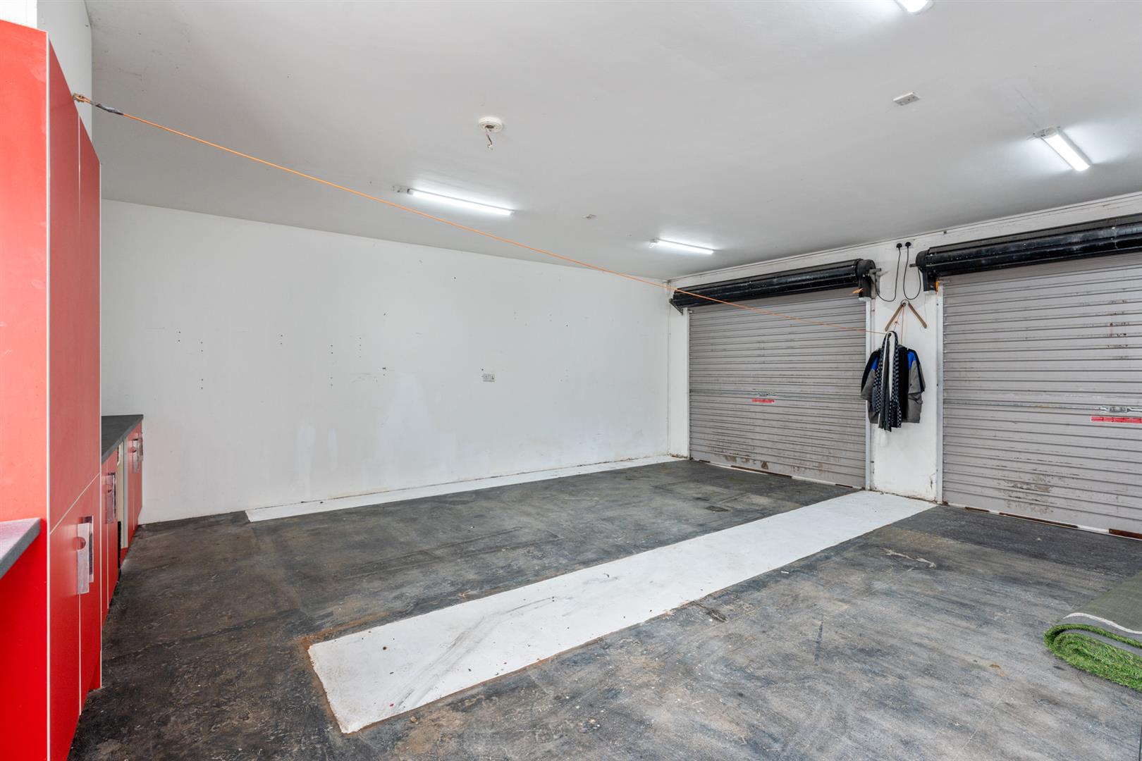 Double garage with electric roller shutter doors, range of high and low level storage units, space for tumble dryer, plumbed for washing machine.