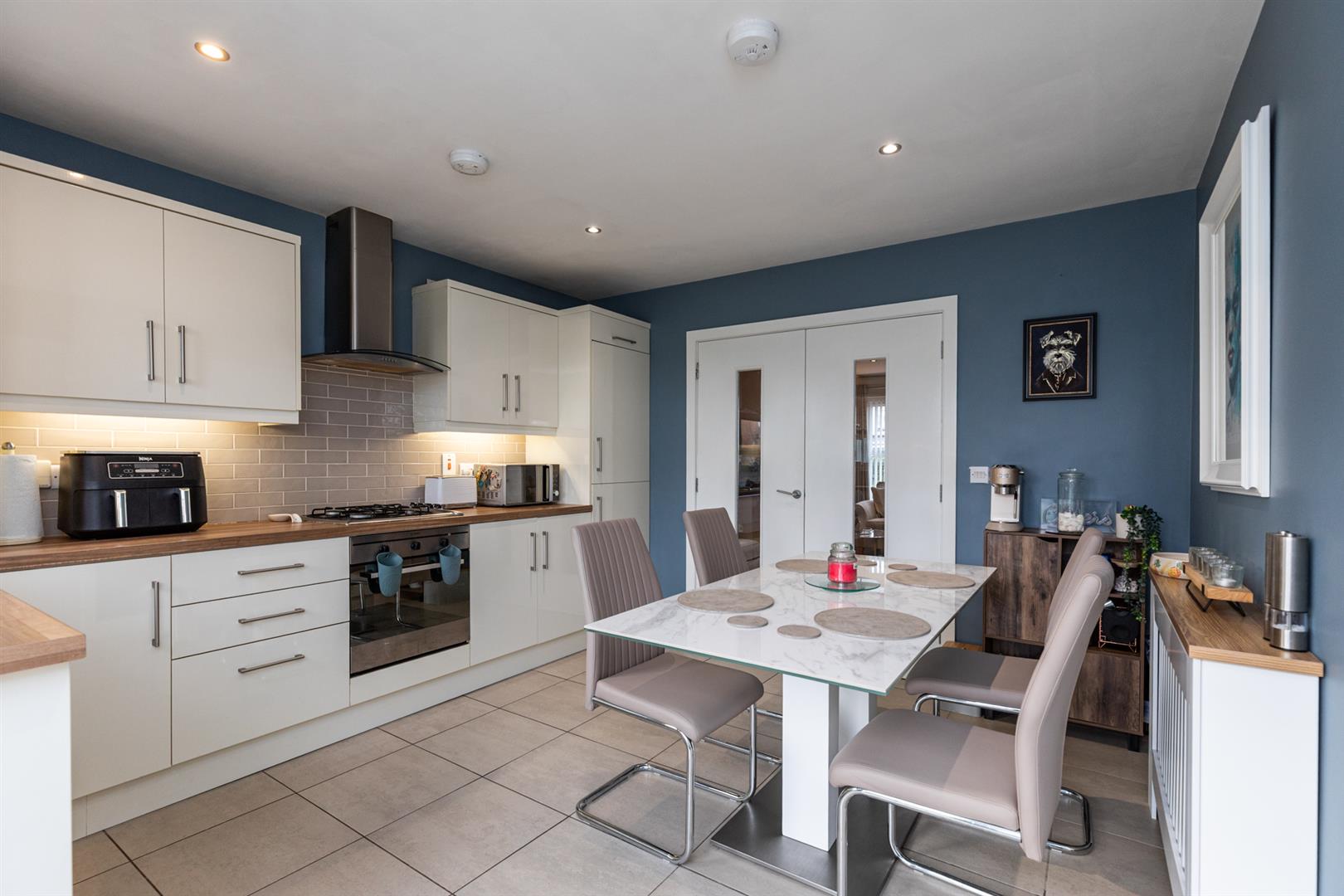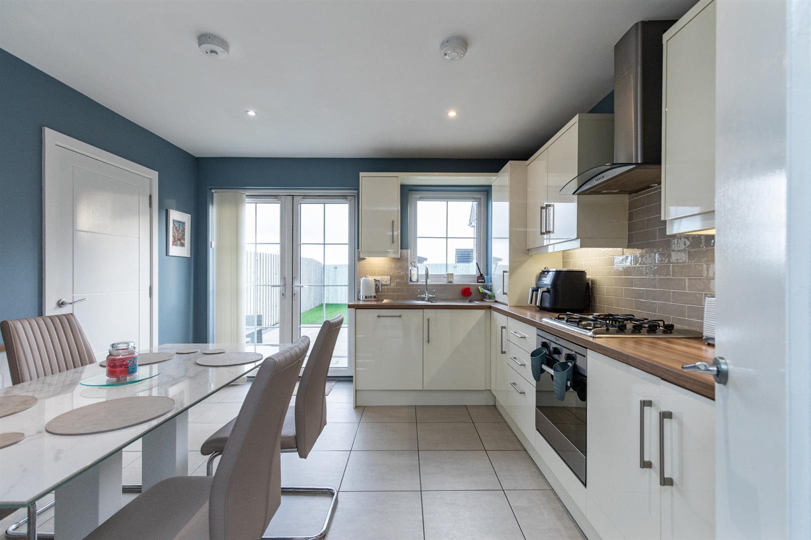 Modern fitted kitchen, range of high and low level units with laminate effect work surfaces, single stainless sink with mixer tap and drainer, integrated appliances; fridge freezer, dishwasher, four ring gas hob, oven and stainless steel extractor hood, enclosed gas fired boiler, partly tiled walls, tiled flooring, recessed spotlights and double doors to enclosed rear garden.
