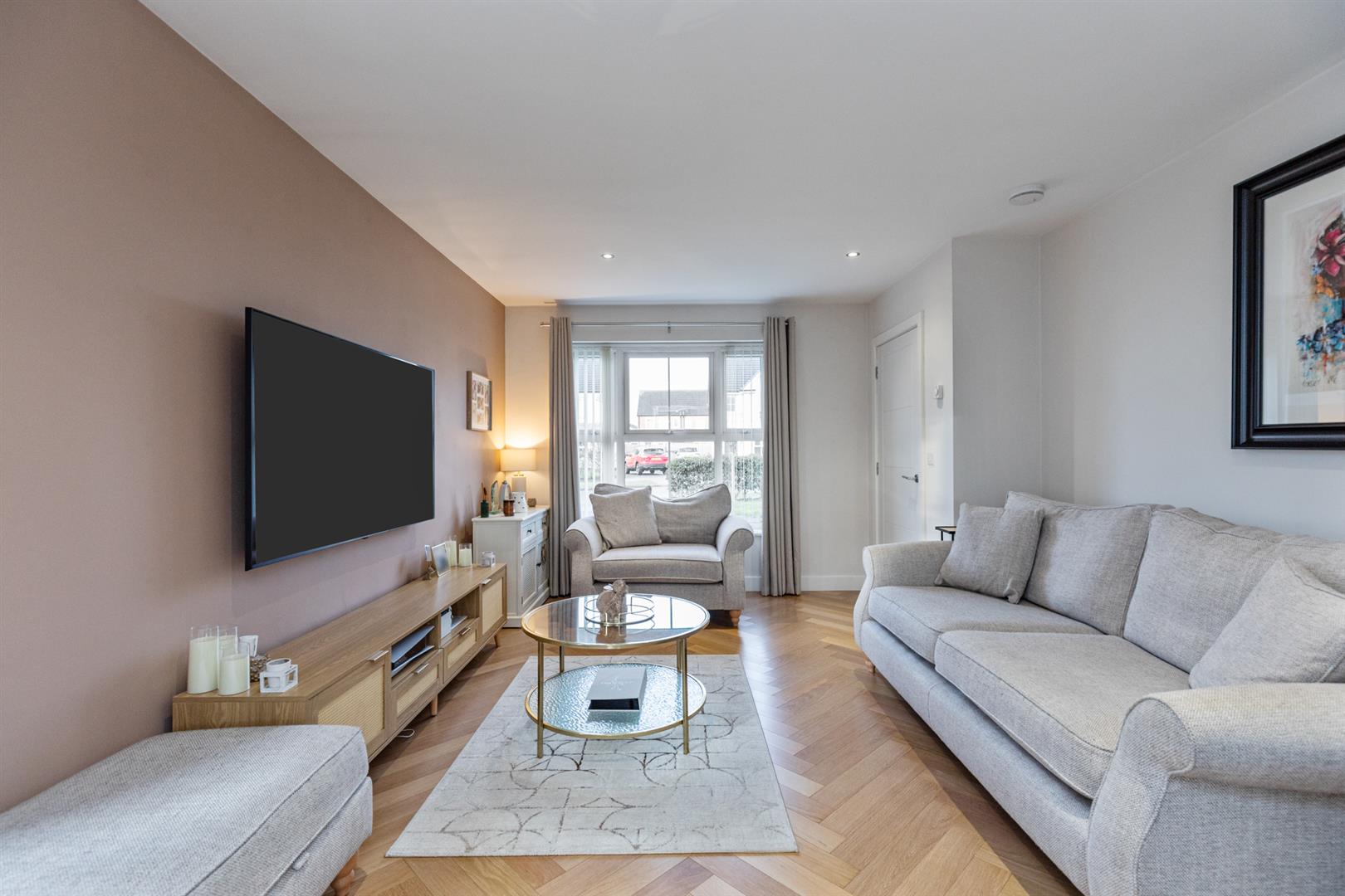 Spacious Living Room Featuring Herringbone Wood Effect Laminate Flooring