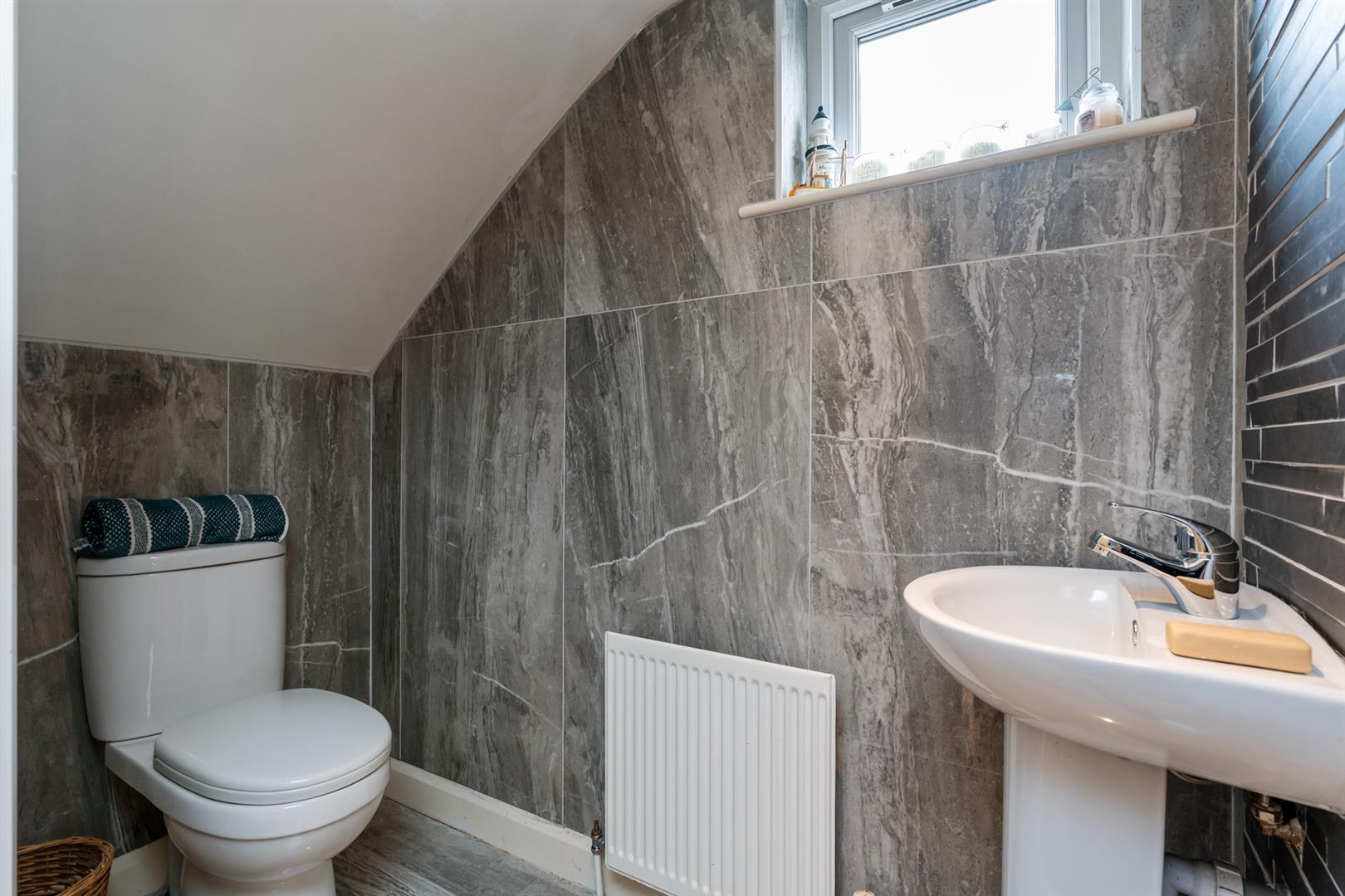 Low flush wc, pedestal wash hand basin with mixer tap, tiled floor, tiled walls, extractor fan, recessed spotlights.