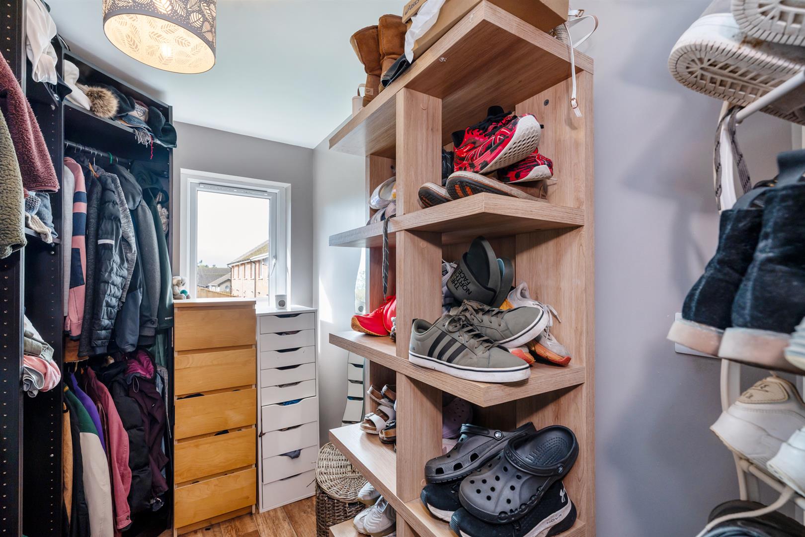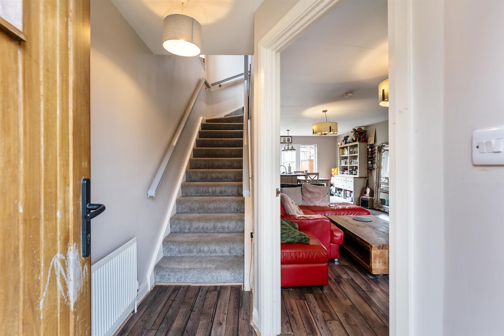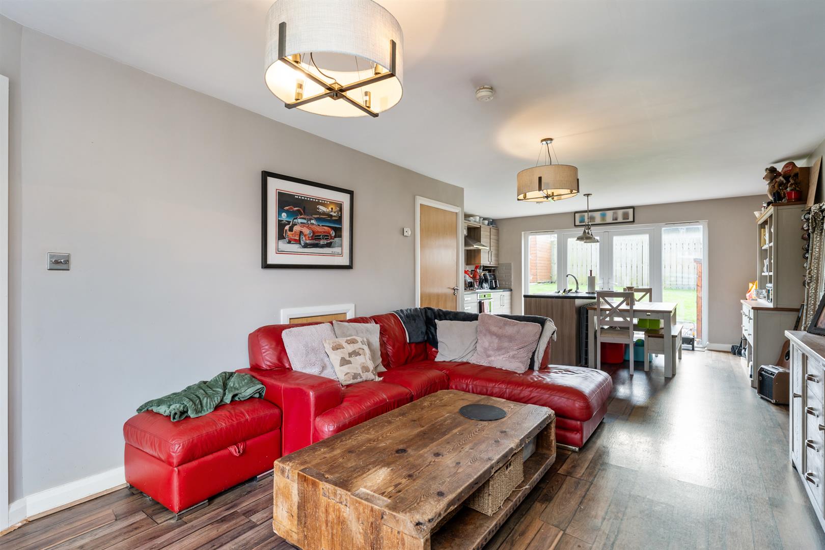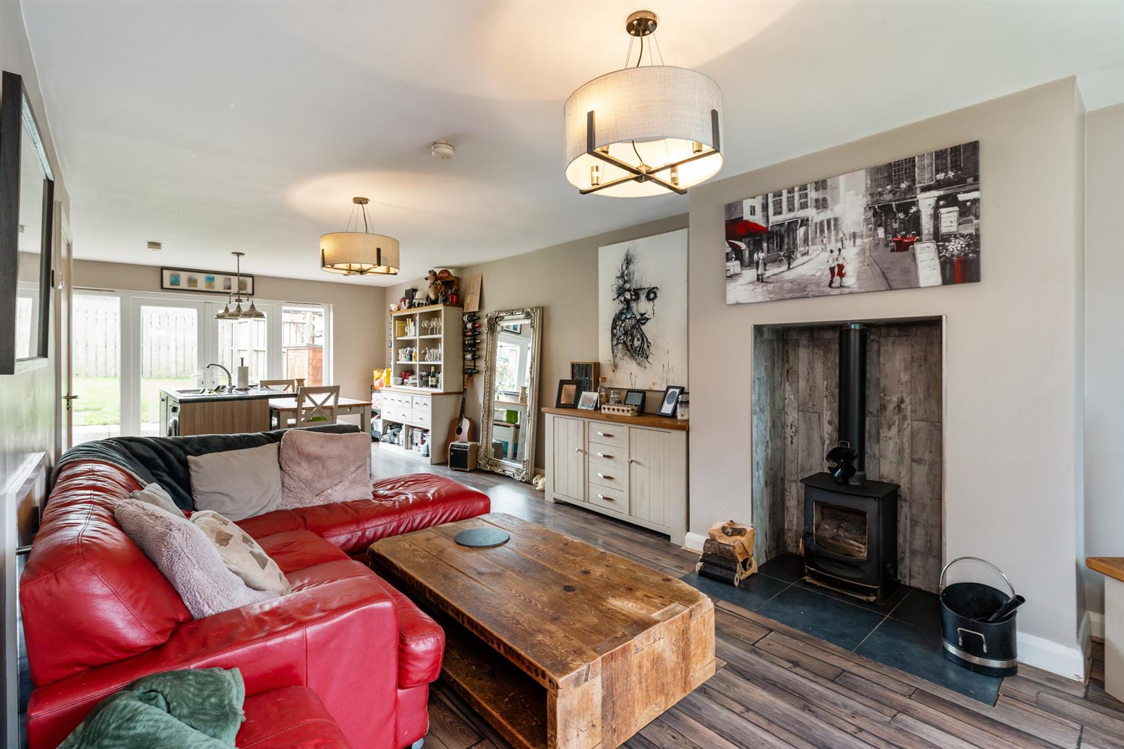 The home is thoughtfully laid out, featuring a spacious open-plan living and dining area complete with a charming log-burning stove, seamlessly leading into a contemporary fitted kitchen with a full range of integrated appliances.