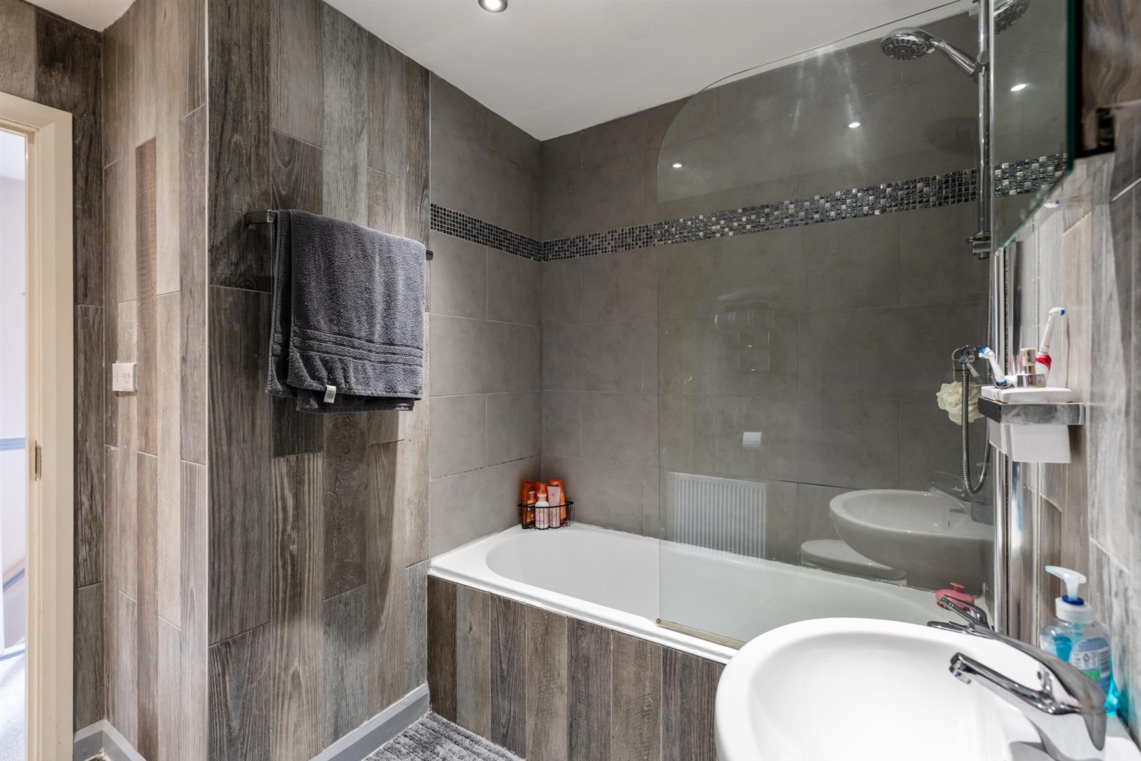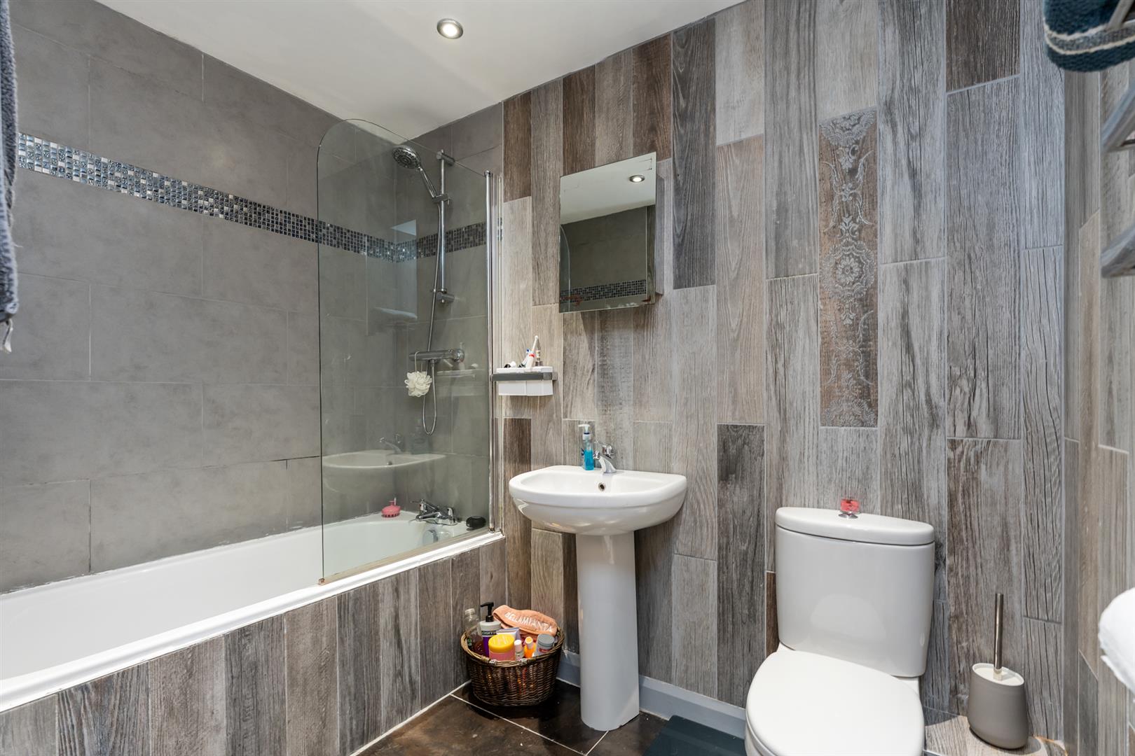 White suite comprising, tiled bath with mixer tap, wall mounted overhead shower, glass shower screen, low flush w/c, pedestal wash hand basin with mixer tap, tiled floor, tiled walls, recessed spotlights, extractor fan.