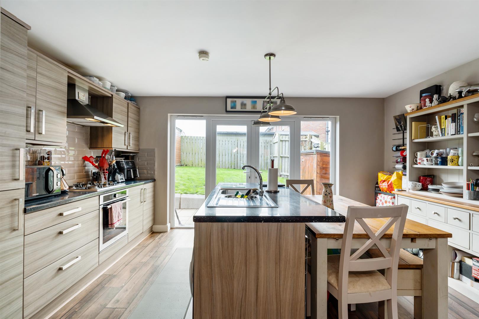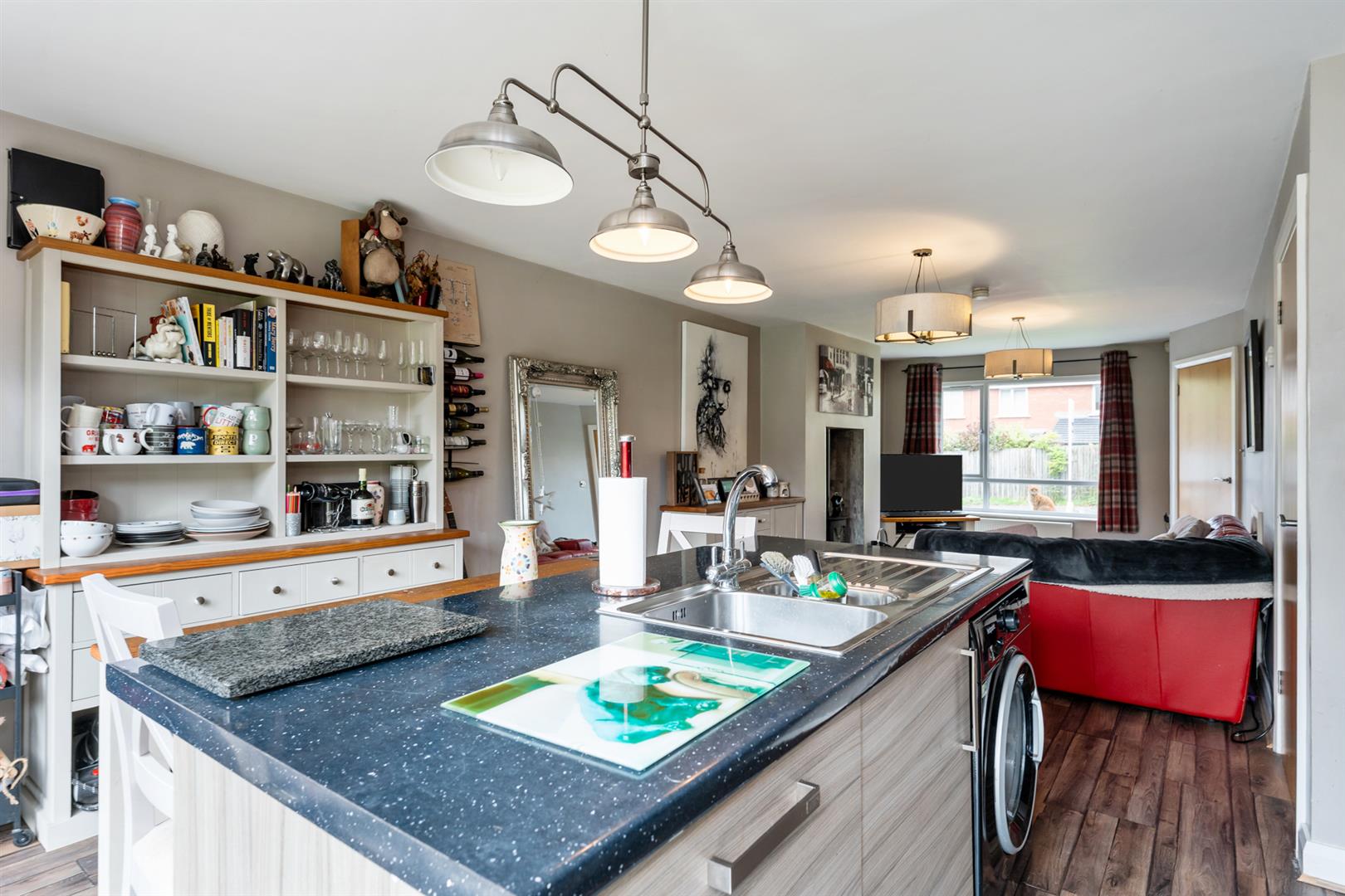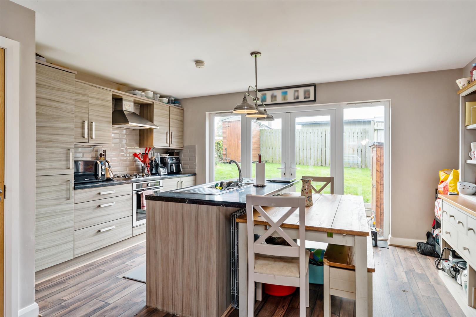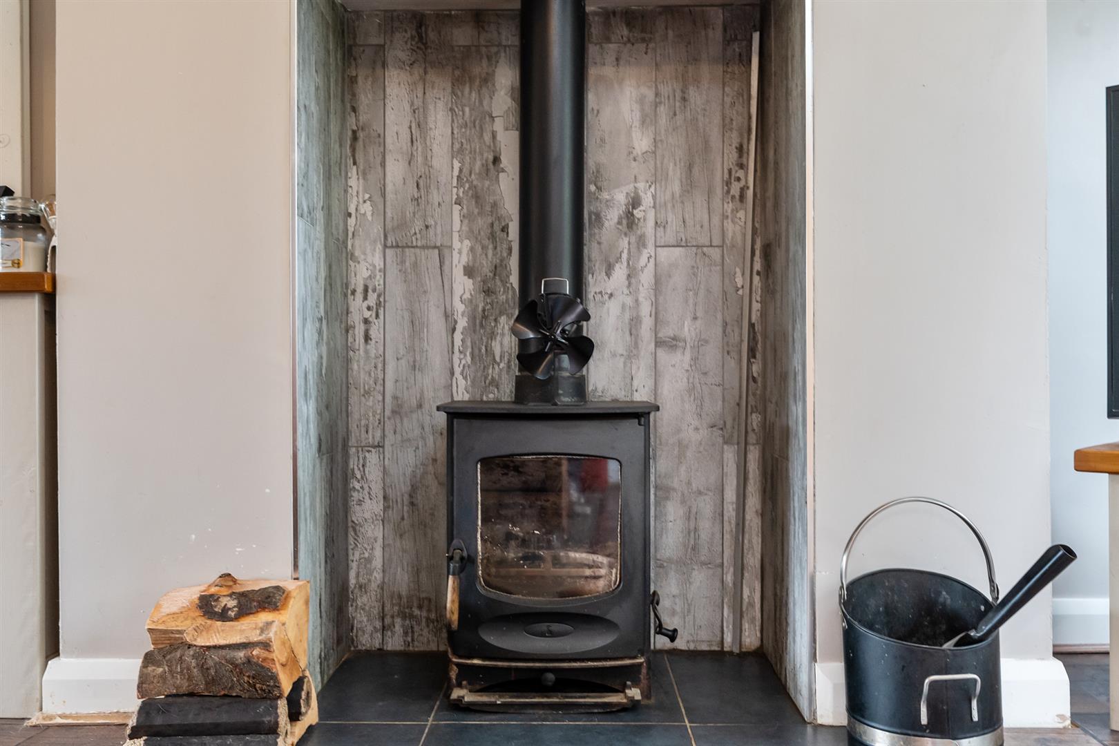 Fitted kitchen with range of high and low level units, laminated work surfaces, 1 1/4 stainless steel sink with mixer tap and drainer, plumbed for washing machine, integrated appliances to include; dishwasher, oven, four ring gas hob, stainless steel extractor hood and fridge freezer, partly tiled walls, space for dining, breakfast bar area, space for dining and double doors to enclosed rear garden. Wood laminate floor, multi-fuel burning stove with tiled hearth and tiled surround.